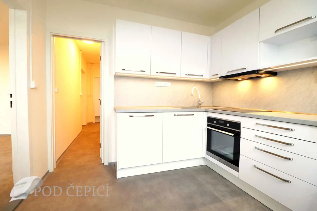 Byt se nabízí bez vybavení, jak patrno z fotografií. Kuchyňská linka disponuje myčkou na nádobí, troubou, indukční deskou a odsavačem par zaústěným do komínu. Teplo a ohřev teplé vody je realizováno pomocí dálkového rozvodu.