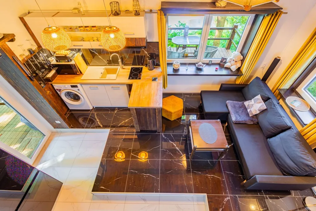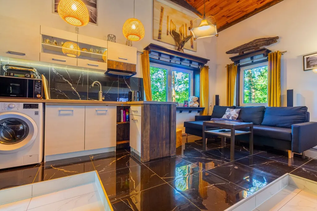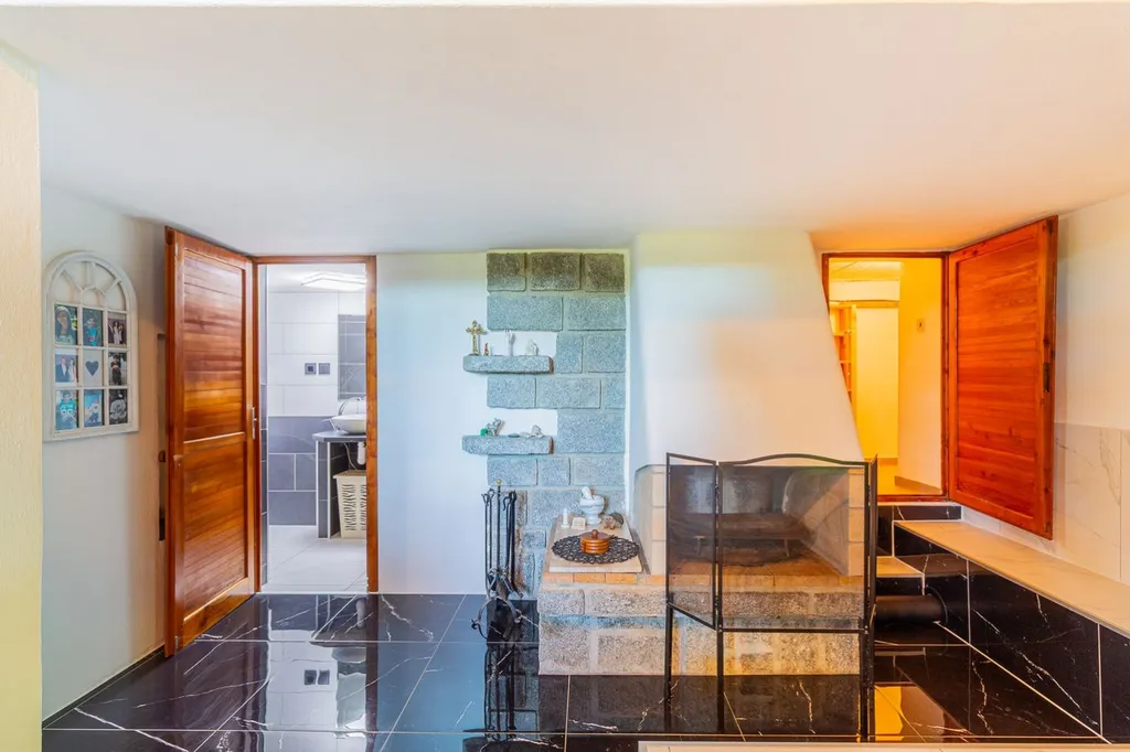 V přízemí se nachází koupelna se sprchovým koutem spojená s WC, technická místnost kde se nachází bojler, kuchyně je propojena s obývacím pokojem s krbem. V patře je ložnice a menší pokoj s další postelí a velká prosklená veranda. Chata má podlahové vytápění, kamerový systém, který lze ovládat na dálku. Tato nemovitost je jako stvořená pro milovníky rybaření, cykloturistiky i rekreačních sportů.