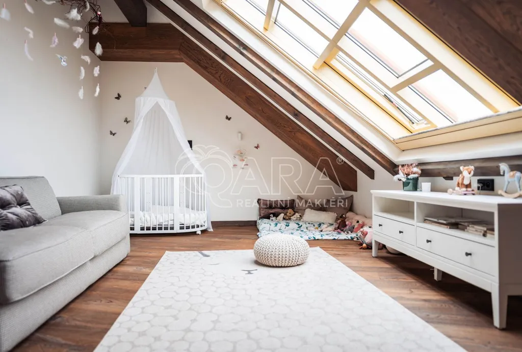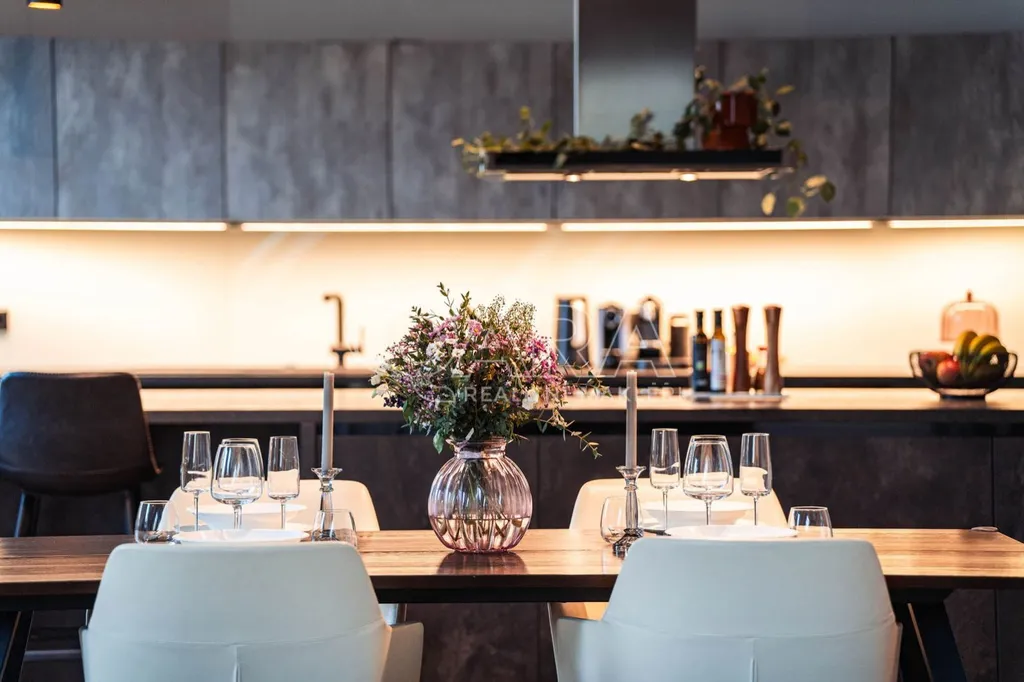 Dominantou bytu je mimořádně prostorný obývací pokoj, přirozeně propojený s plně vybavenou kuchyní a elegantní jídelnou. Dispozice zahrnuje hlavní ložnici, dětský pokoj, pokoj pro hosty, další pokoj, dvě samostatné šatny a tři komfortní koupelny každá s kvalitním vybavením, vanou či sprchovým koutem. Velkorysá vstupní hala nabízí nadstandardní úložné prostory díky vestavěným skříním.