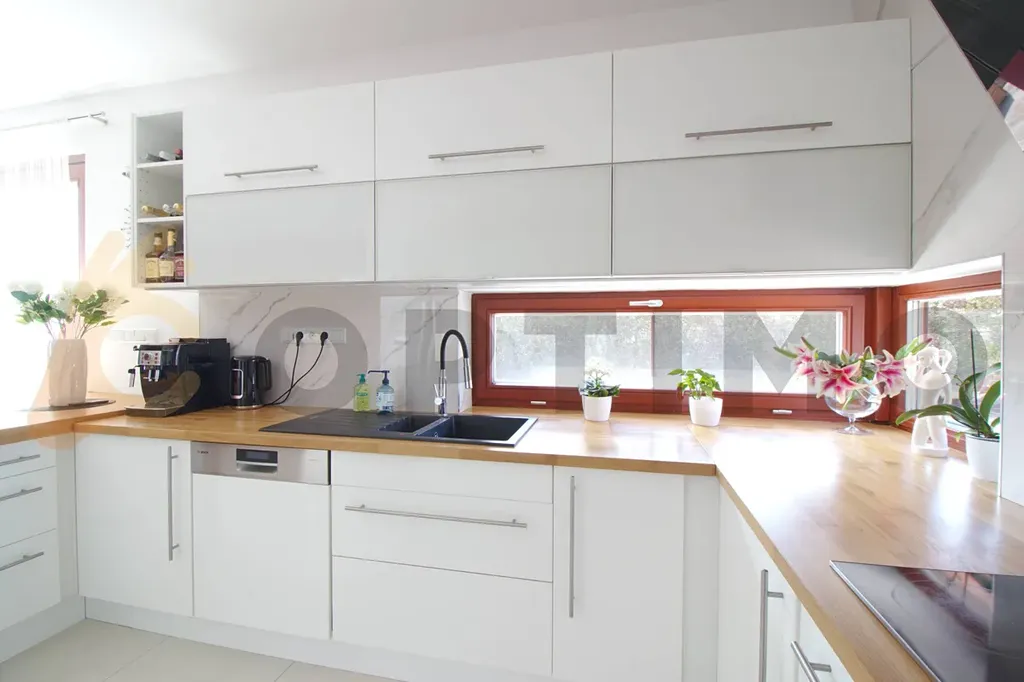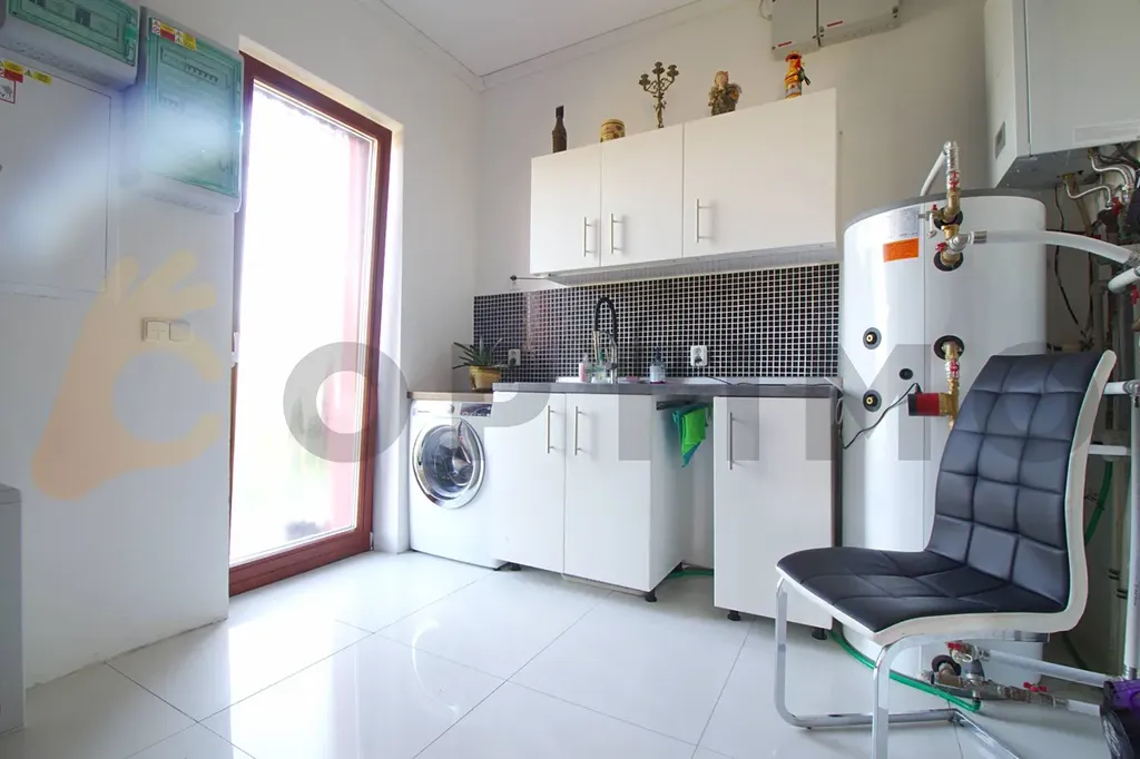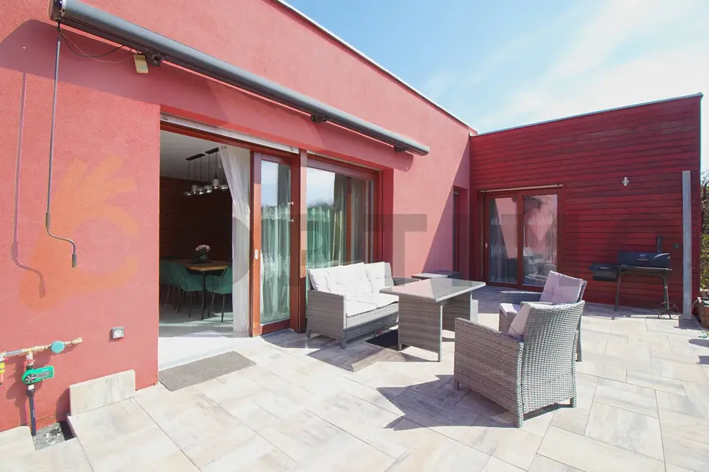 Tento dům je symbolem udržitelnosti. Je vybaven nejnovějšími technologiemi jako jsou solární panely s výkonem 7,2kW s možností navýšení, dvěma bateriemi o kapacitě 11,6kWh a nabíječkou pro elektromobil. Také se můžete těšit na nižší náklady na provoz díky úsporným řešením jako je příprava na tepelné čerpadlo a instalované dva zásobníky na dešťovou vodu. Obecní vodovod a tlaková kanalizace jsou samozřejmostí.