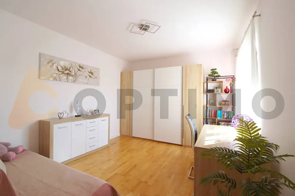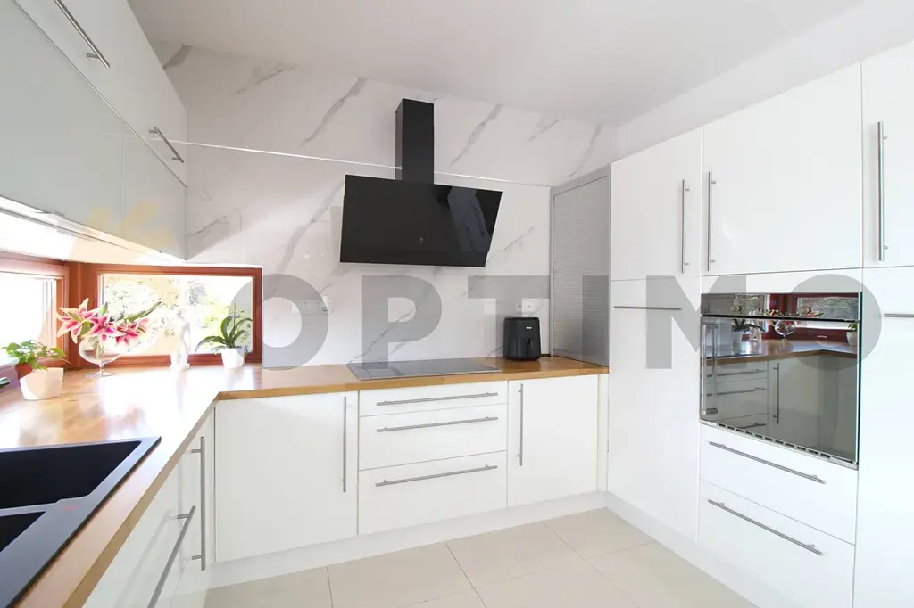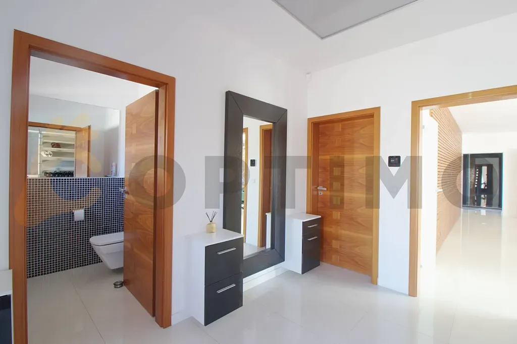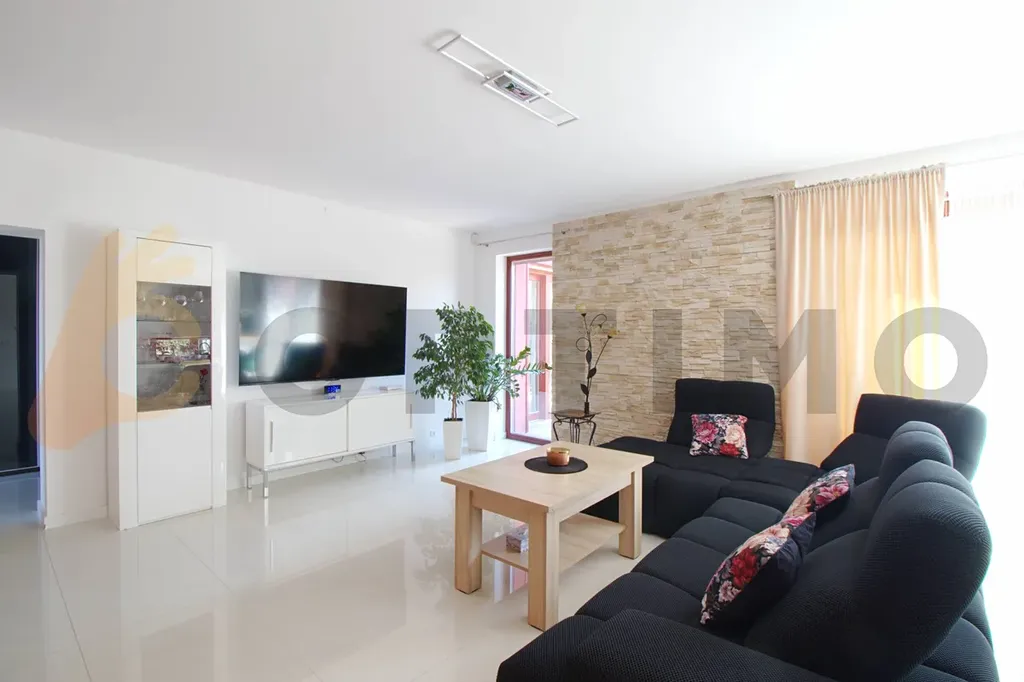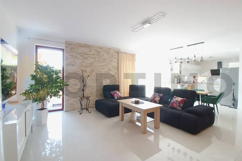 Vstupem do domu procházíte prostornou předsíní (9,5 m2) do technické místnosti (11,4 m2), samostatné toalety (3,2 m2) a dále do obývacího pokoje spojeného (38,9 m2) s kuchyňským koutem (11,7 m2). Pohodlí zde zvyšuje podlahové topení a dokonalé osvětlení. Kuchyň na míru je vybavena atypickým rohovým oknem a vestavěnými spotřebiči, včetně velké elektrické varné desky s digestoří, myčky, trouby a americké lednice. V obývacím pokoji Vás okouzlí obrovské portálové dveře, které vám umožní přímý vstup na terasu bez schodů a také rychlé vyvětrání prostoru. Celkový vzhled místnosti doplňuje vestavěné bodové osvětlení. Přes obývací pokoj do chodby (12,2 m2) s úložným prostorem ústící do koupelny (13,4 m2) a 3 ložnic (17,0 m2, 17,0 m2 a 15,9 m2).