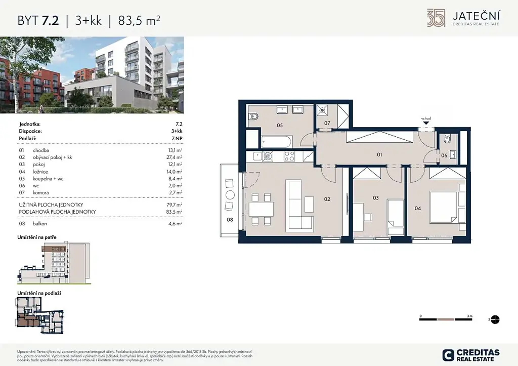 Dovolujeme si vám nabídnout byt 3+kk o celkové výměře 84 m², umístěný v 7.NP, který je součástí projektu Jateční 35 v samém srdci Holešovic.