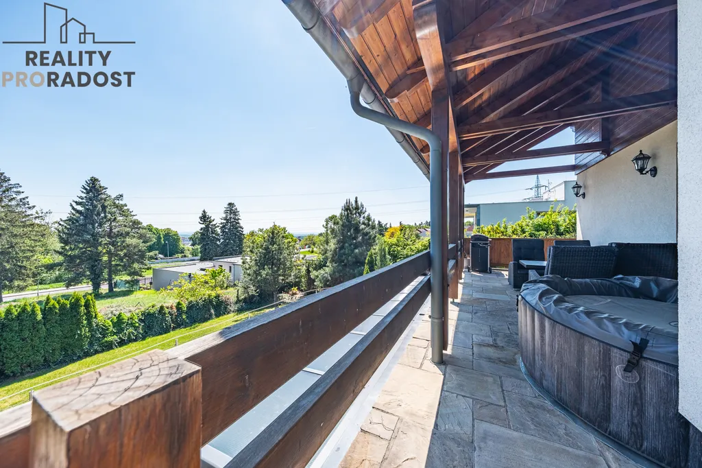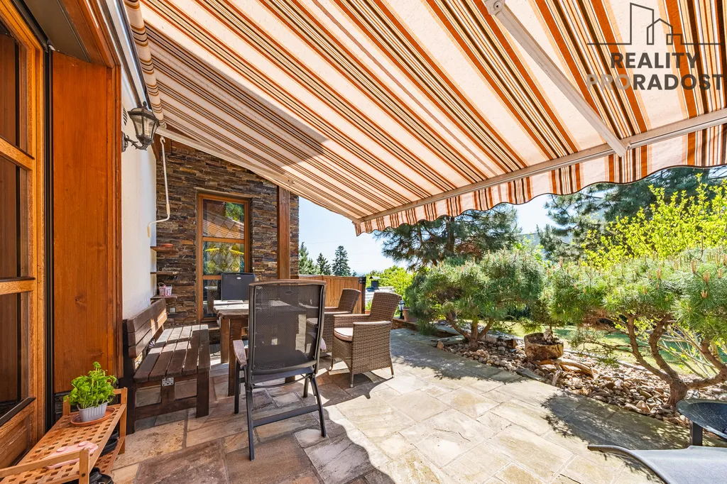 Kolem domu se rozprostírá udržovaná zahrada se vzrostlými stromy a keři, kde můžete trávit chvíle odpočinku. Naleznete zde zděný a zastřešený altán s centrálním grilem pro společné chvíle s přáteli. Na něj plynule navazuje zahradní jezírko. Neméně zajímavý pro Váš relax bude krytý bazén 7x3,5 m s protiproudem pro udržení fyzičky a velká terasa s výhledem do zeleně, kde můžete s rodinou trávit příjemné chvíle. Zavlažování zahrady zajišťují čtyři okruhy z retenční nádrže s obsahem 6 m3. Sekání trávníku za Vás zastane robotická sekačka.