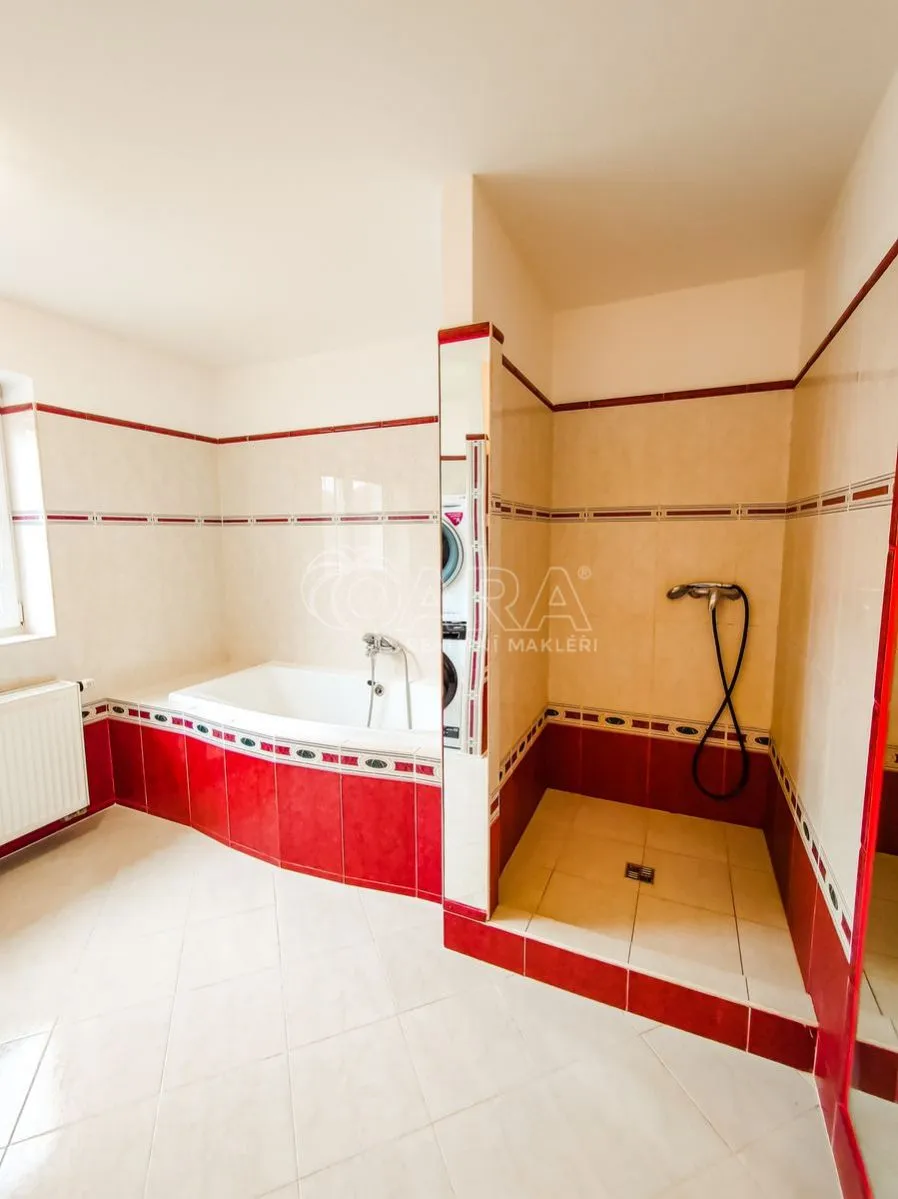 Dále je zde koupelna s vanou, bidetem a toaletou, velká šatna a především obývací pokoj s krbem, propojený s moderní kuchyní a jídelním koutem. Kuchyně je plně vybavena vestavnými spotřebiči, navazuje na ni praktická spižírna a půlkruhový výklenek ideální pro rodinný jídelní stůl.