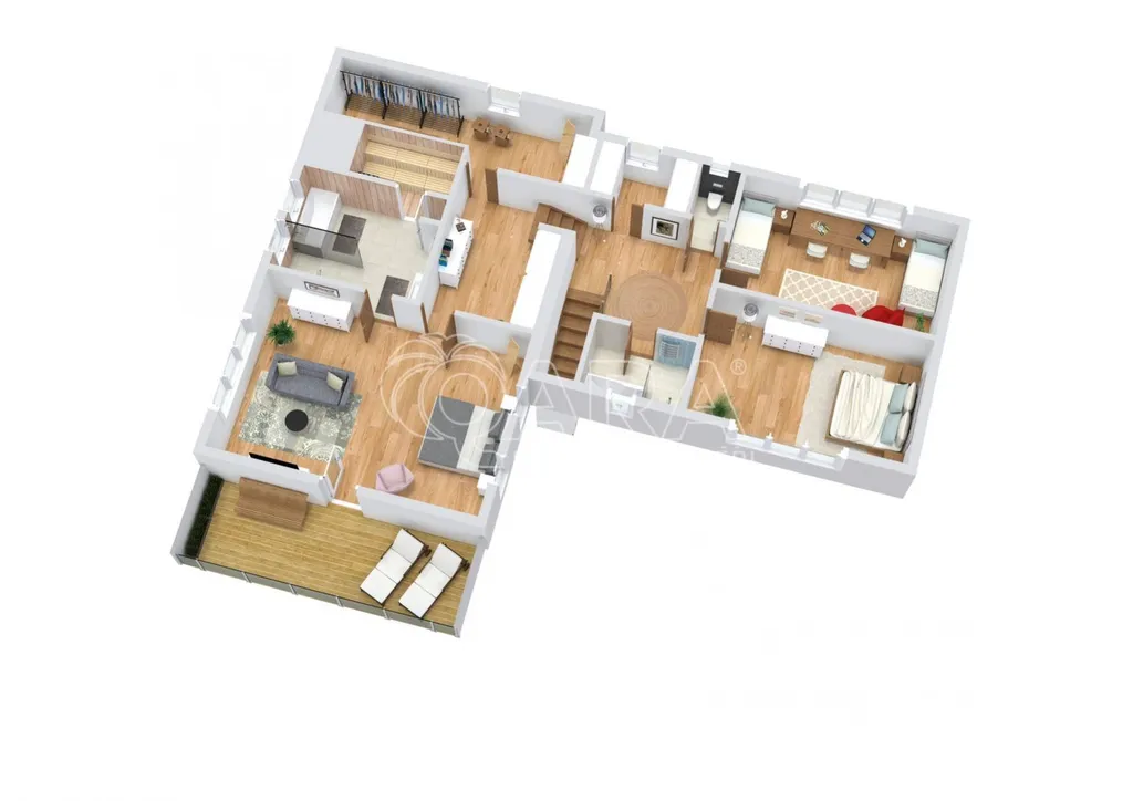 Vila disponuje prostorným přízemím, které nabízí elegantní kuchyň s obývacím pokojem a výstupem na jižní terasu, dále se zde nachází jeden pokoj, 2x šatna, 2x komora, koupelna a toaleta. V prvním patře najdete prostornou ložnici s terasou s nádherným výhledem, vlastní koupelnou se saunou. Další dva pokoje, koupelnu s vanou a sprchovým koutem a samostatnou toaletu. V suterénu domu je prádelna, dvě technické místnosti a sklad.
