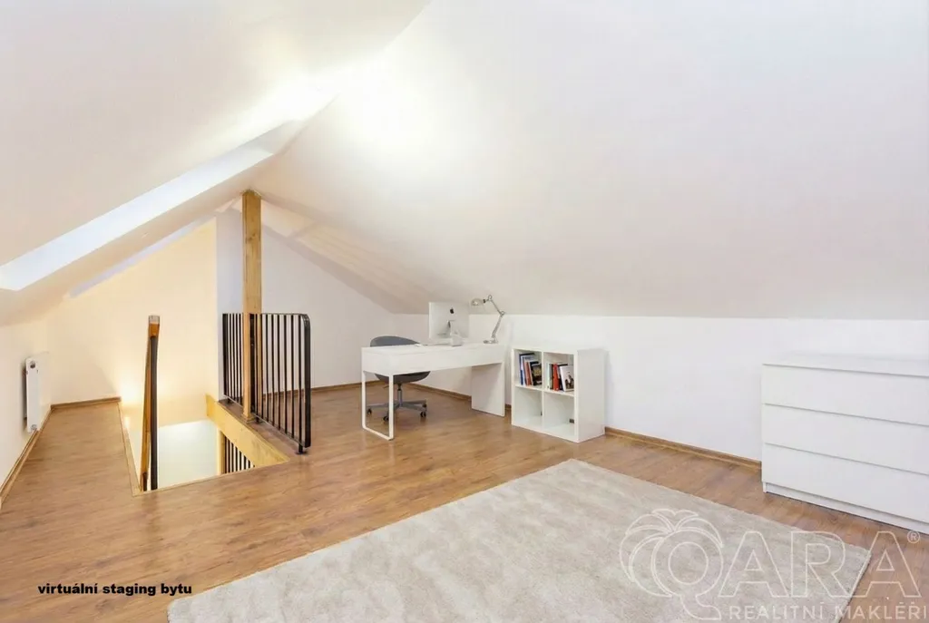 Byt má dispozici 3+kk, nabízí prostornou ložnici, koupelnu a podkrovní pokoj, který není jen další místností. Je to prostor pro přemýšlení, tvoření, práci i klid. Ideální ložnice s pracovnou nebo útočiště, kam si člověk jde vyčistit hlavu.