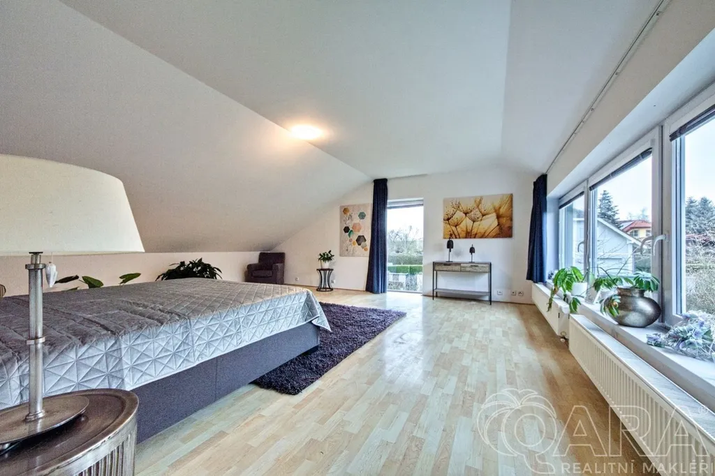 Zázemí: dvojgaráž + další parkování na pozemku, mnoho vestavěných šaten a úložných prostor.