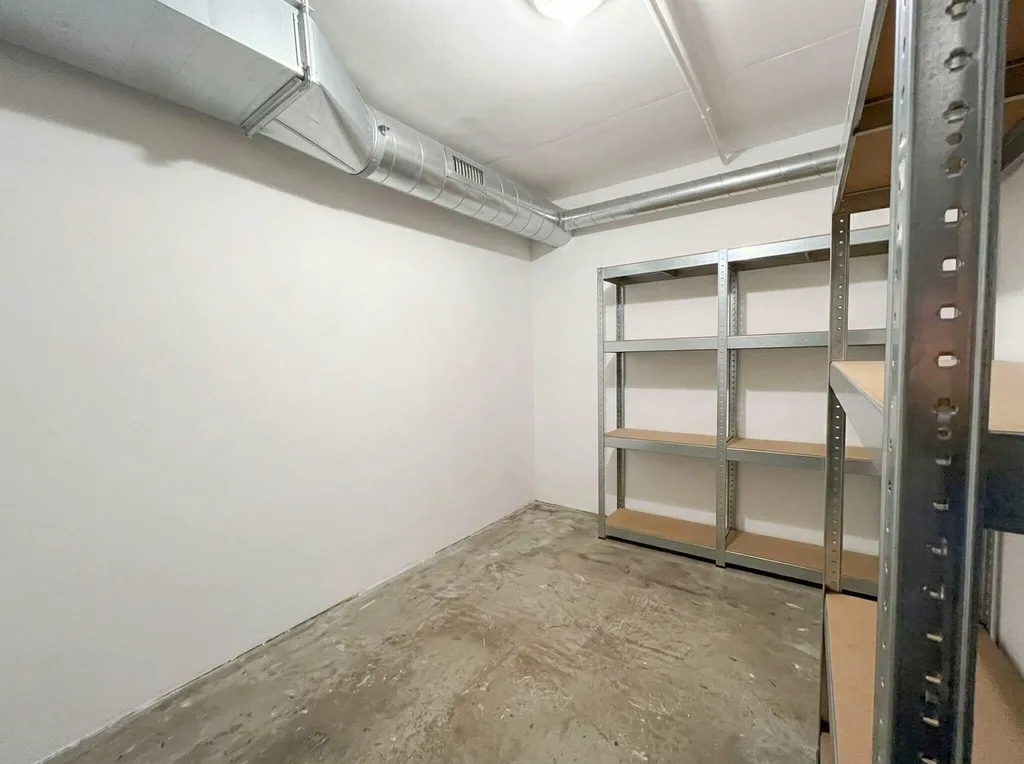K bytu náleží dvě garážová stání a samostatný skladovací prostor u parkování s regály – ideální pro sezónní věci, sportovní vybavení nebo kufry.