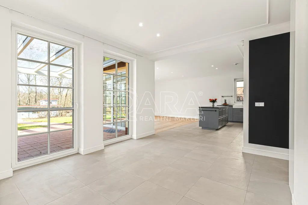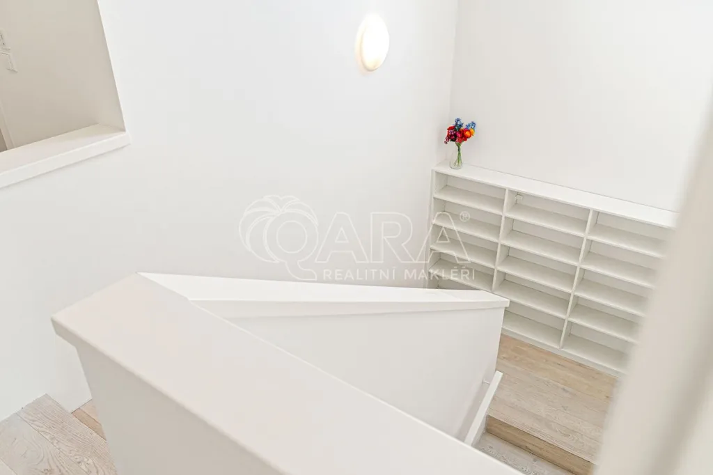 Dispozice domu nabízí několik pokojů, tři koupelny, šatnu i praktické technické zázemí. Součástí je také garáž a samostatný prostor vhodný například pro pracovnu nebo podnikání.