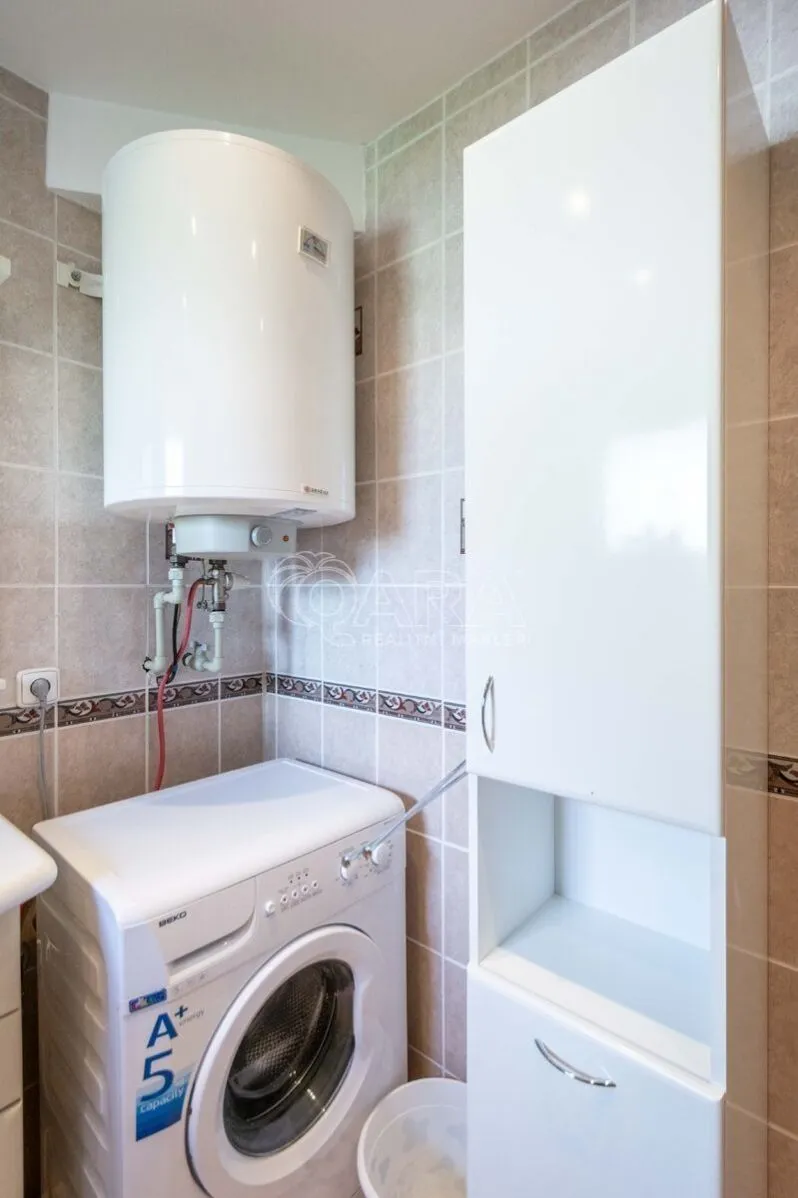 Dispozice bytu o velikosti 43 m2: vstupní chodba se šatní skříní, koupelna se sprchovým koutem, pračkou a WC mísou. Kuchyně se spotřebiči (el. trouba, varná deska, digestoř) + obývací pokoj. Teplá voda zajištěna vlastním bojlerem, vytápění el. přímotopy. K bytu patří sklepní kóje.