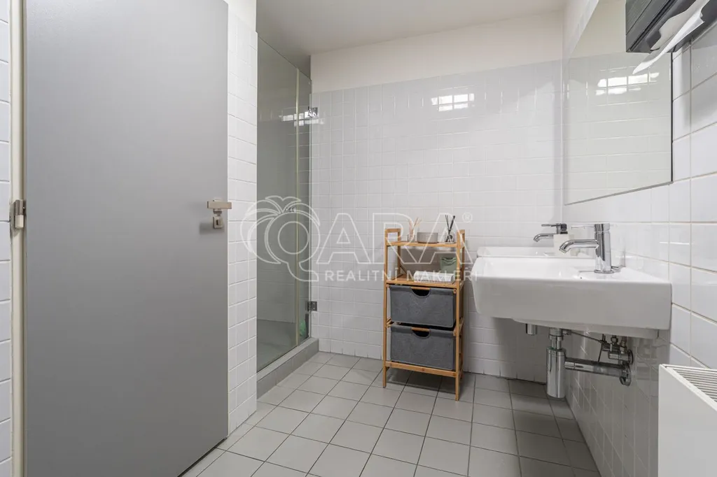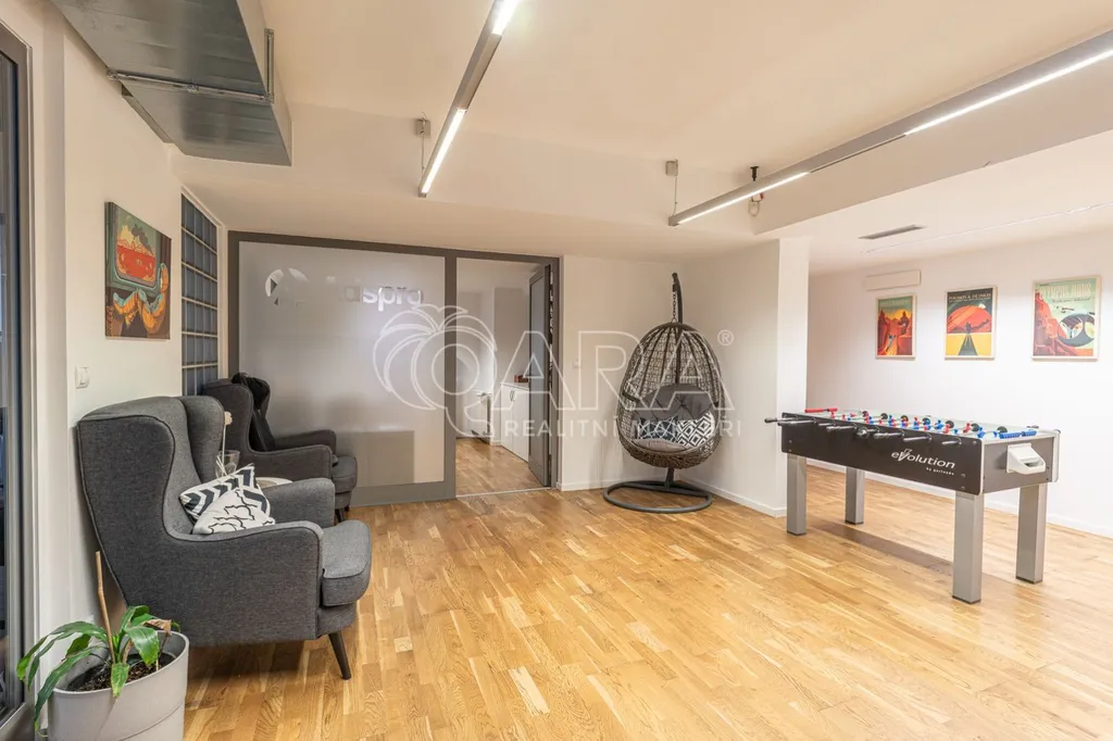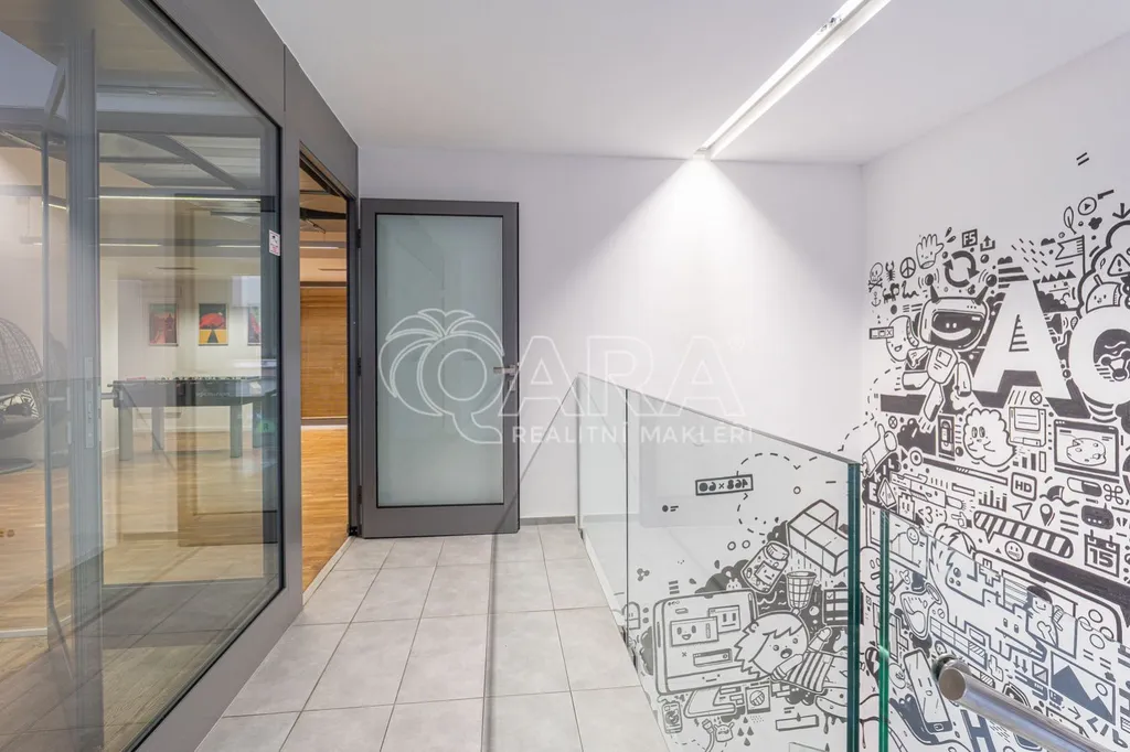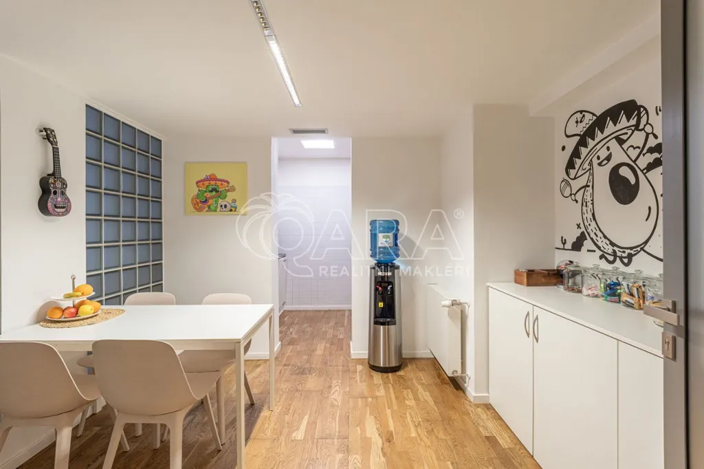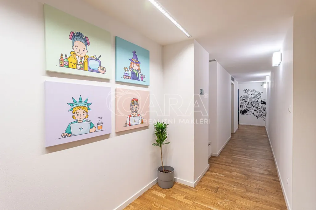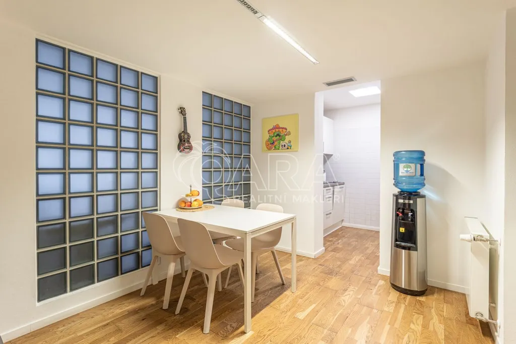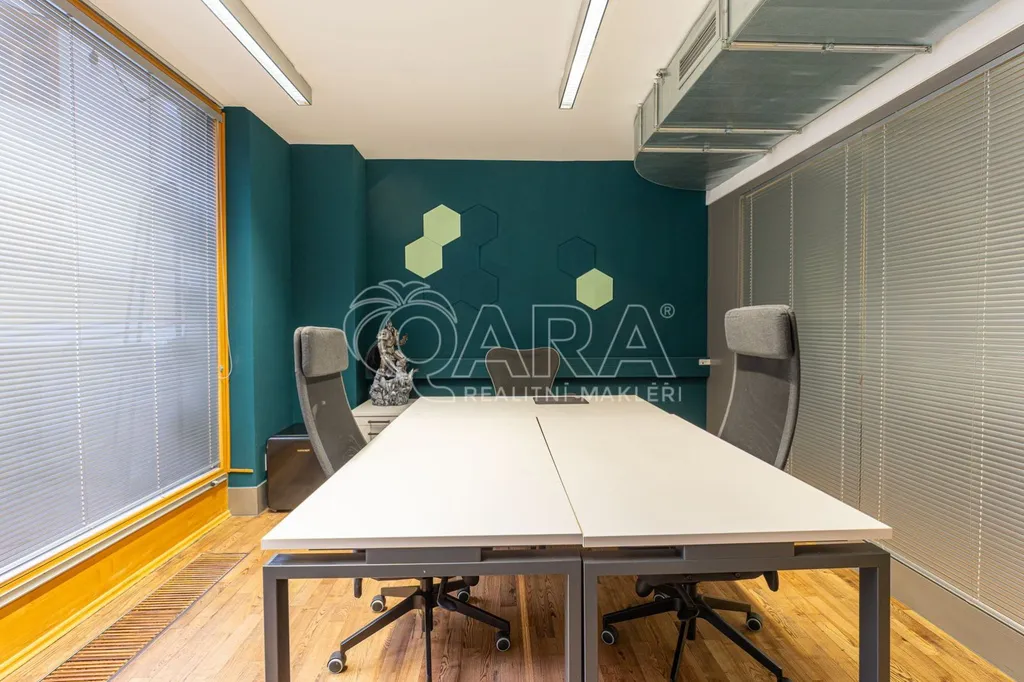 Prostor o celkové rozloze kanceláří 335 m je klimatizovaný. Dispozice nabízí dvě větší otevřené místnosti, dvě místnosti oddělené skleněnou stěnou, přičemž jedna z nich má vstup na terasu o velikosti 17 m, samostatnou uzavřenou místnost, zasedací místnost a prostor pro recepci či posezení návštěv. Zázemí zahrnuje kuchyňku, jídelní kout, 2x moderní sociální zařízení se sprchou, serverovnu a úklidovou místnost.
