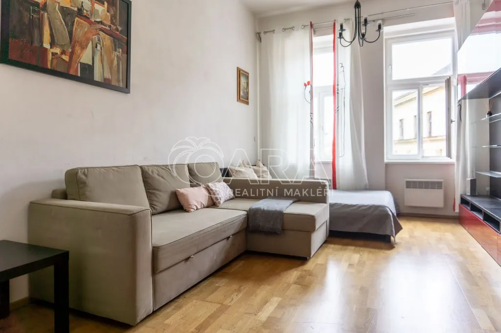 Nabízím k pronájmu byt 1+1 o velikosti 32,3 m2, který se nachází ve 4. NP cihlového domu s výtahem. Byt je vzdušný díky vysokým stropům (3,4 m).