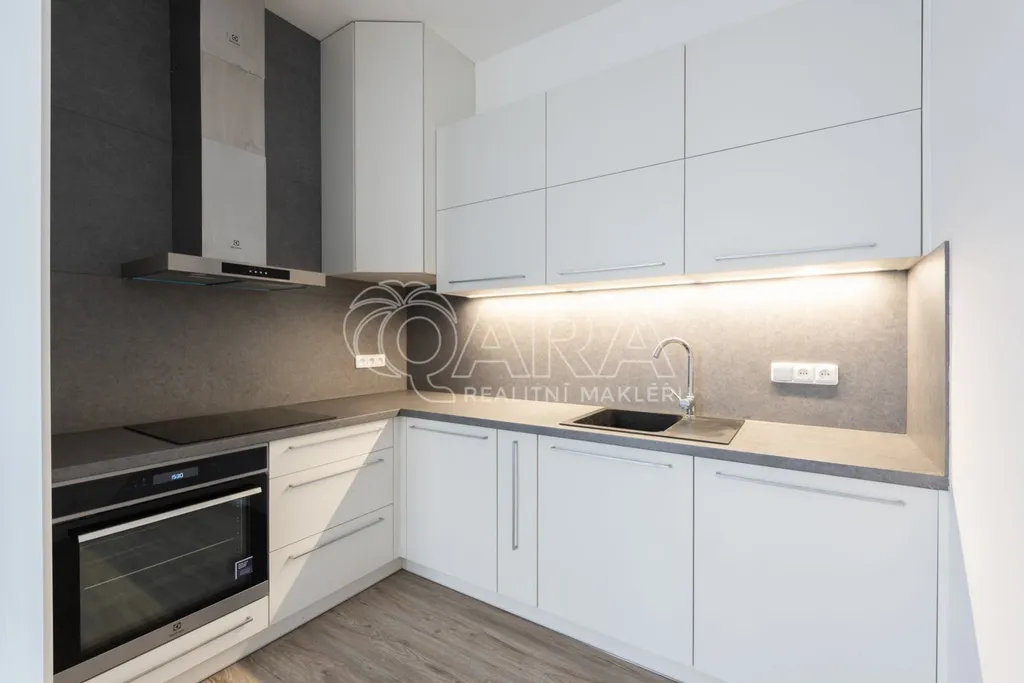 Spotřebiče: indukční varná deska, elektrická trouba, myčka a digestoř, lednice a pračka v bytě nejsou