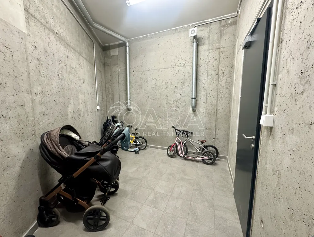 Interiér bytu je zařízen v moderním stylu s důrazem na kvalitu a praktičnost. K dispozici je plně vybavená kuchyňská linka se všemi spotřebiči, vestavné skříně poskytující dostatek úložného prostoru a nábytek na míru v obývacím pokoji. Ložnice s manželskou postelí s úložnými prostory a dalšími skříněmi je doplněna o pracovní kout, což ocení zejména zájemci pracující z domova. Jedna ložnice zůstává prázdná a nájemce si ji tak může dovybavit dle svého uvážení. Velkým benefitem je komora přímo v bytě a další úložný prostor ve formě komory na patře.
