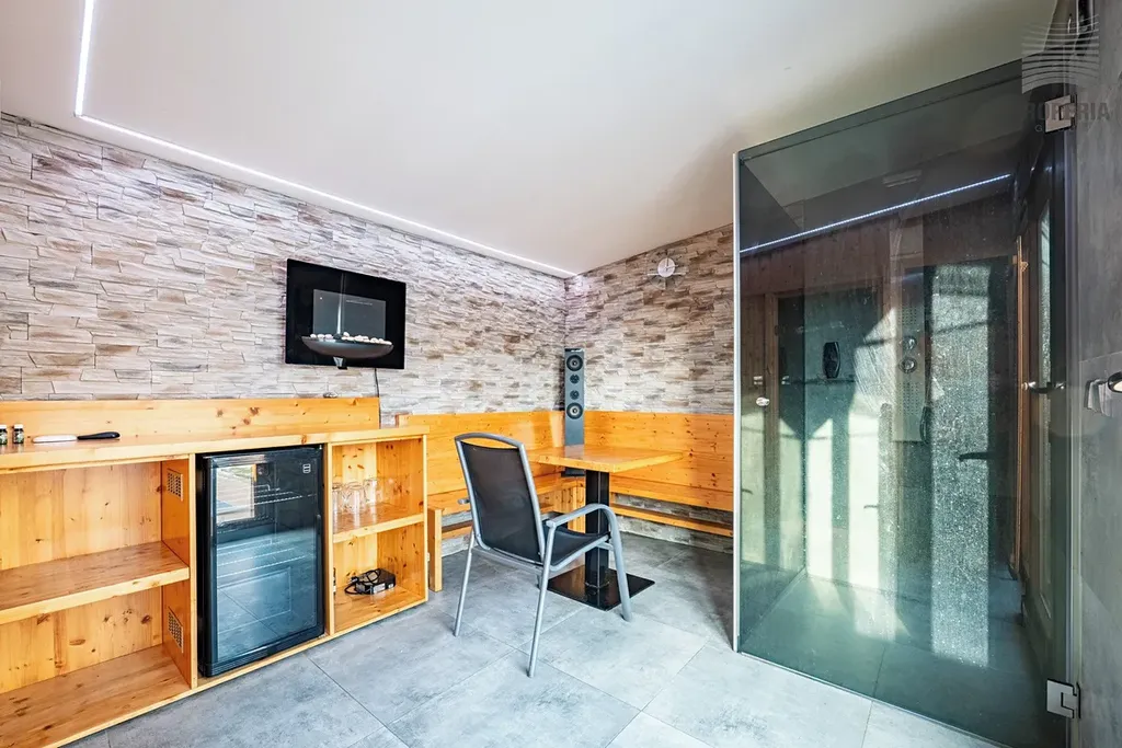 Jedním z hlavních benefitů této nemovitosti je jižně orientovaná zahrada, která nabízí skutečný pocit soukromí a relaxu. Najdete zde elegantní altánek s posezením a grilem, nerezový bazén s invertorovým čerpadlem umožňujícím ohřev i chlazení vody a především samostatný wellness domek se saunou, zázemím a WC, plně napojený na vodu, elektřinu i kanalizaci.