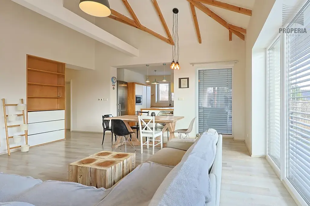 Dominantou domu je prostorný obývací pokoj s jídelnou (31 m²) s kuchyňským koutem 8,4 m² a zvýšeným stropem umocňující bydlení v domě. Dům nabízí tři samostatné pokoje, koupelnu s WC a samostatné WC