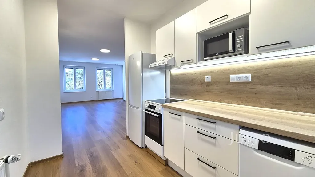 Byt je vybaven zcela novou kuchyňskou linkou včetně spotřebičů a praktickými vestavěnými skříněmi.