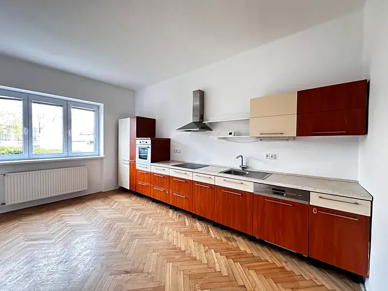 Byt je prostorný, dobře dispozičně řešený, prosluněný a připravený k okamžitému užívání. V kuchyni je osazená kuchyňská linka včetně spotřebičů (elektrická varná deska, digestoř, elektrická trouba, myčka a samostatně stojící lednice s mrazákem). Koupelna je vybavená vanou. Součásti bytu je rovněž menší pokoj s oknem vhodný jako pracovna nebo šatna.