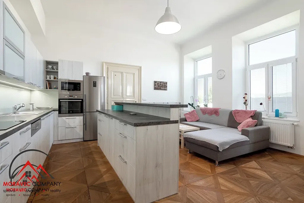 Byt nabízí velkorysý prostor vhodný i pro početnější rodinu nebo kombinaci bydlení a práce z domova. Výhodou je prostorná kuchyň s barem a vestavěnými spotřebiči, dvě koupelny, dostatek úložného prostoru díky vestavěným skříním a balkon, který poskytuje příjemné místo pro odpočinek.