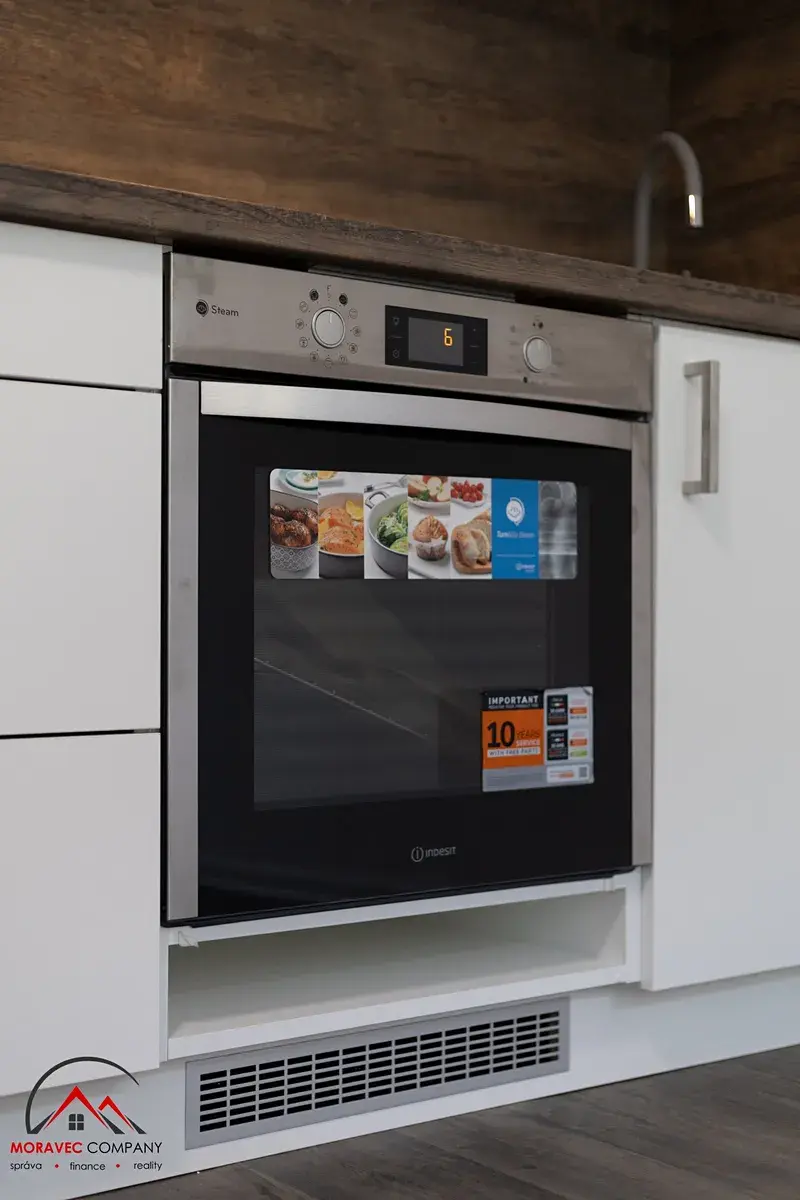 Vybavení bytu zahrnuje kuchyň s elektrickou troubou, indukční varnou deskou a digestoří, koupelna je vybavena sprchovým koutem, zrcadlovou skříňkou na hygienické potřeby a WC. Ohřev vody zajišťuje elektrický bojler.