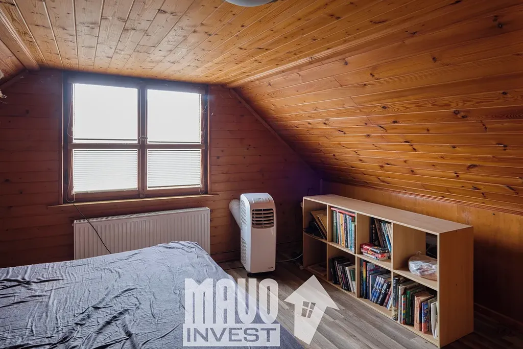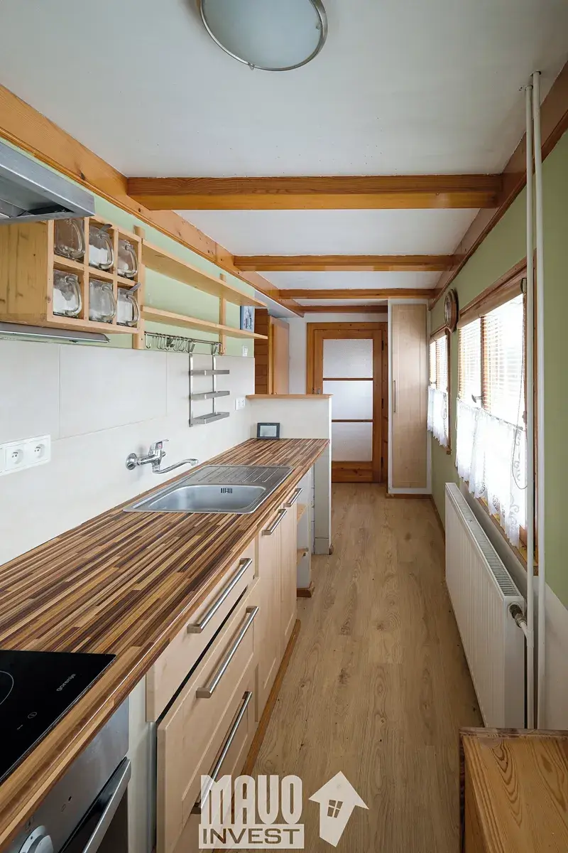 Obývací prostor s kamny nabízí příjemnou atmosféru. Kuchyň má praktické uspořádání a dostatek úložného prostoru. V podkroví se nachází ložnice. K dispozici jsou dvě koupelny, jedna se sprchovým koutem, druhá s vanou. Nechybí ani technické zázemí a dílna pro kutily.