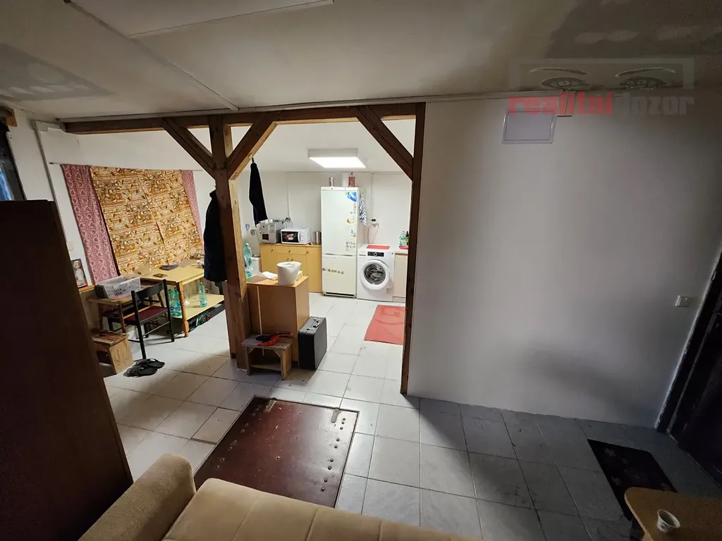 Ve vyvýšenější části chaty obytná místnost cca 25 m2 s kamny na tuhá paliva, obytnou stěnou, pohovkou a jídelním stolem, dále schodiště do podkroví (spíše na uložení věcí nebo v létě i na přespání).