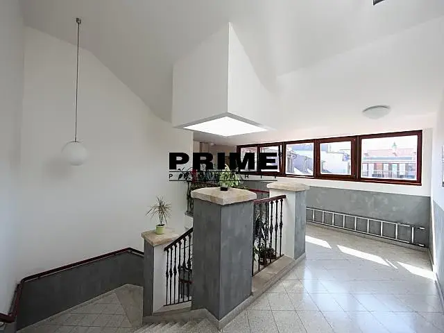 Dispozice dolní části prostor: vstupní předsíň, prostorná kancelář (29,5m2) se vstupem na terasu (12m2) a s dřevěným schodištěm do horního podlaží, plně vybavená kuchyň se spotřebiči (sklokeramická varná deska, trouba, myčka, mikrovlnná trouba, lednice s mrazákem), druhá kancelář (15m2) s malou kuchyňkou a koupelna (sprchový kout, umyvadlo a toaleta). Horní podlaží: 3 samostatné podkrovní kanceláře (29m2, 15,5m2 a 10m2; největší kancelář má malou terasu 2m2) a koupelna (vana, umyvadlo, toaleta a bidet).
