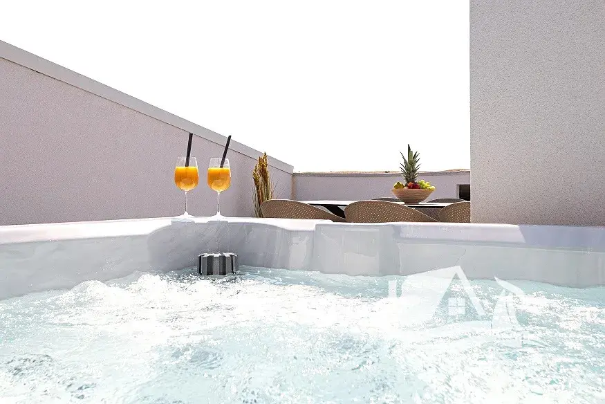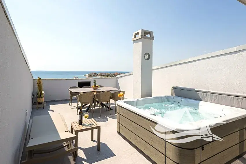 Dominantou celé nemovitosti je soukromá střešní terasa, která vytváří prostor, kam se budete vracet každý den. Výhled na otevřené moře, dostatek soukromí a vlastní vířivka dávají tomuto místu charakter, který se běžně nehledá, ale když ho jednou zažijete, nechcete o něj přijít. Je to místo pro klid, setkání i chvíle, které si člověk pamatuje.