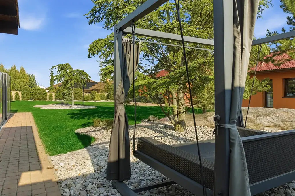 Zahrada tvoří doslova soukromý park se vzrostlými stromy, cedry, borovicemi a designovými solitérními kameny. Nechybí automatická závlaha Hunter, ozvučení Bose napojené na smart systém, inteligentní osvětlení ani robotická sekačka Segway.