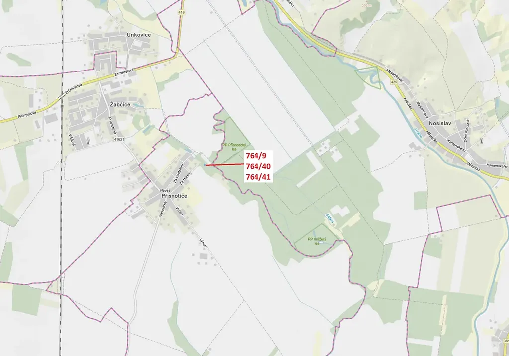 Lesní pozemky o výměře 702 m2, parcelní čísla 764/9, 764/40, 764/41, podíl 1/1, katastrální území Přísnotice, obec Přísnotice, obec s rozšířenou působností Židlochovice, okres Brno-venkov, Jihomoravský kraj.