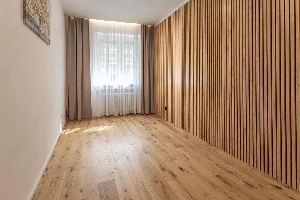 Nemovitost prošla kompletní rekonstrukcí s důrazem na kvalitní materiály, funkčnost a elegantní design. V celém bytě jsou dřevěné podlahy, sádrokartonové stropy s nepřímým osvětlením a instalovány jsou i blackout závěsy pro maximální komfort. Byt je navíc odhlučněn pomocí moderních obkladových akustických panelů, což zajišťuje klidné bydlení i v centru města.