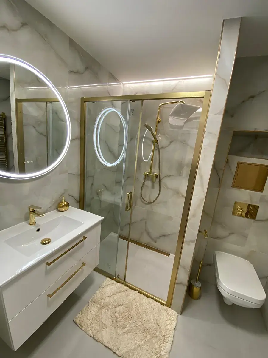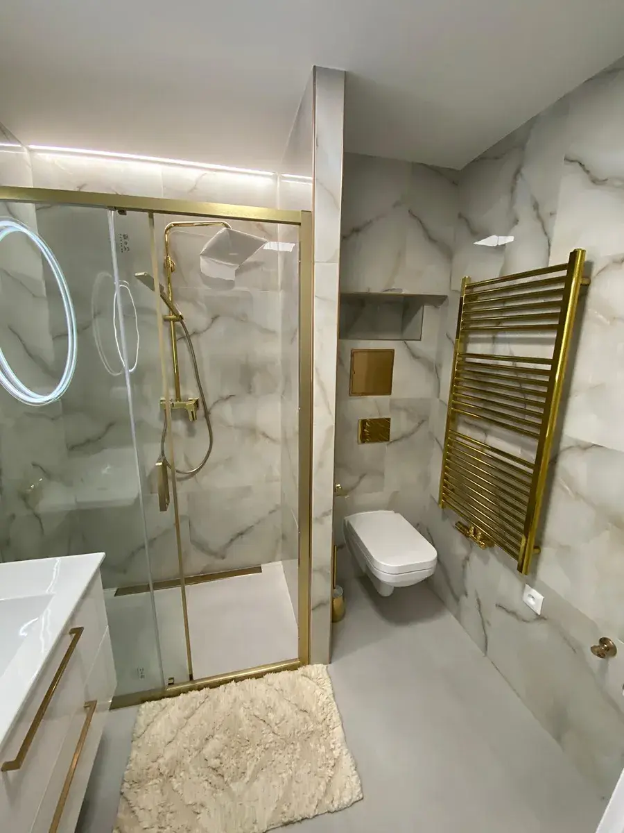 Dominantou interiéru je prostorná koupelna se stylovými zlatými prvky a designová kuchyňská linka vybavená značkovými spotřebiči BOSCH. Vstup do bytu chrání nové bezpečnostní dveře.