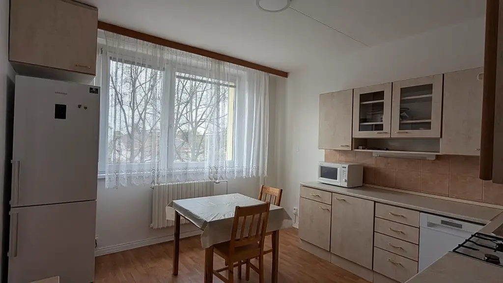 Dispozice bytu je velmi praktická – dominantou je velkorysá kuchyň s dostatkem prostoru pro větší kuchyňskou linku, která nabízí komfortní zázemí i pro náročnější vaření.