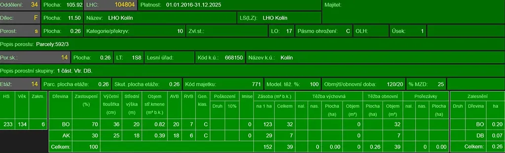 - p.č. 592/3 vedená jako lesní pozemek o celkové výměře 2 631 m2, z toho vlastníme podíl 1/3 tedy 877 m2 (stáří lesa 144 let - zastoupení dřevin borovice, akát).