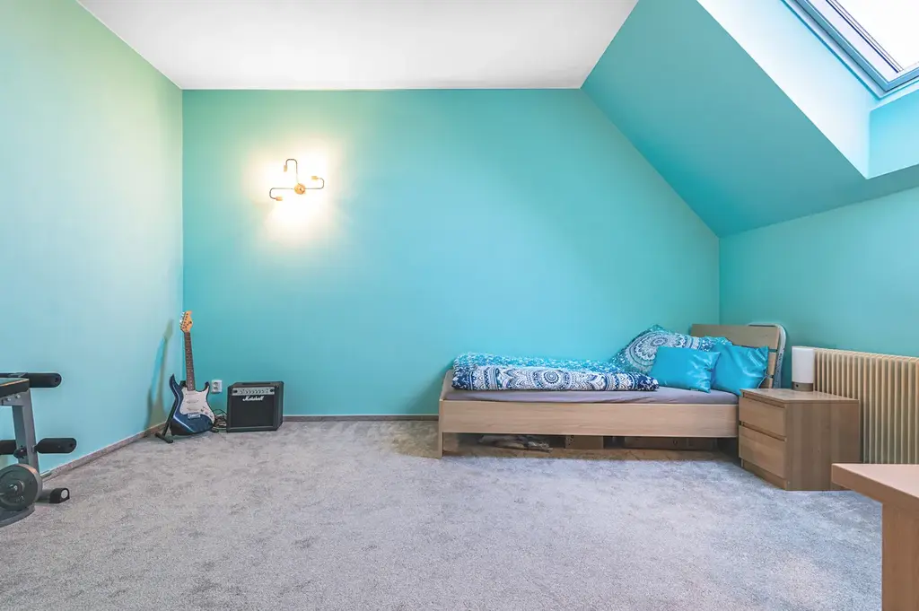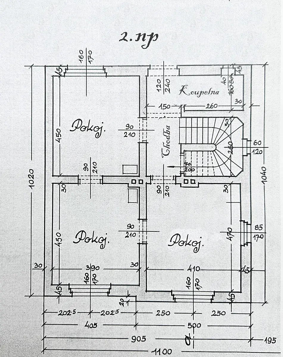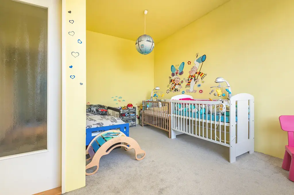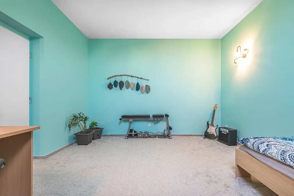 V patře jsou k dispozici tři samostatné pokoje přístupné z chodby, což zajišťuje dostatek soukromí pro rodiče i děti, případně možnost pracovny či hostinského pokoje. Je zde další místnost, a to koupelna pro horní patro, která ještě není dokončena. Další možnosti nabízí velká půda s dalším prostorem (jedna místnost je zde vybudována viz. foto).
