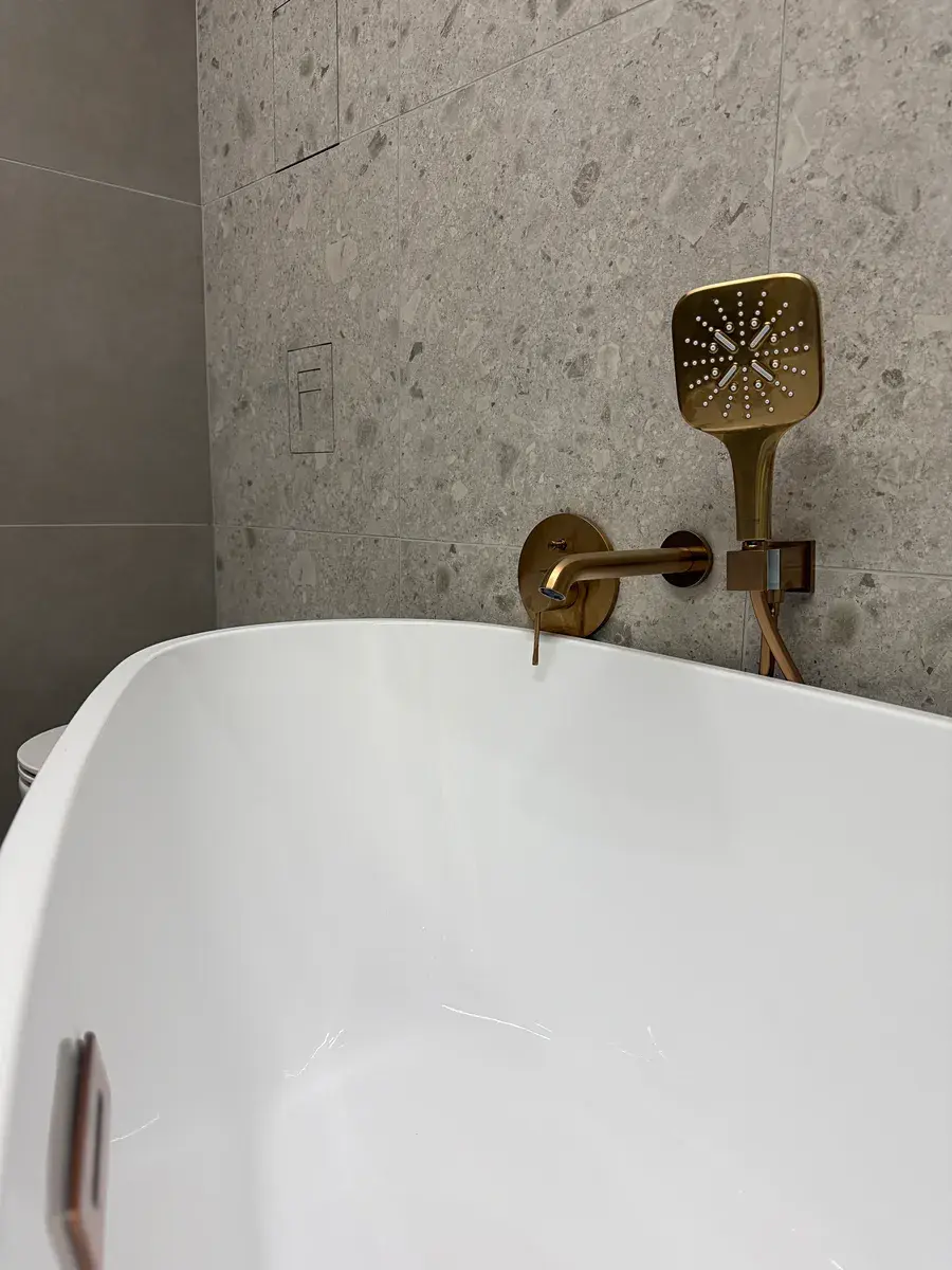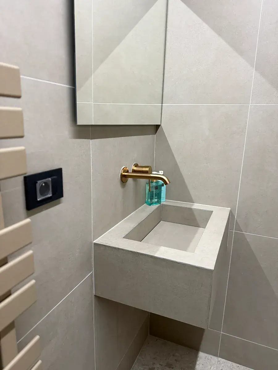 • Unikátní koupelna: Volně stojící vana, umyvadlo i ovládání WC vyrobené na míru z obkladu. Kamenické rohy. Veškeré baterie jsou značky Grohe.