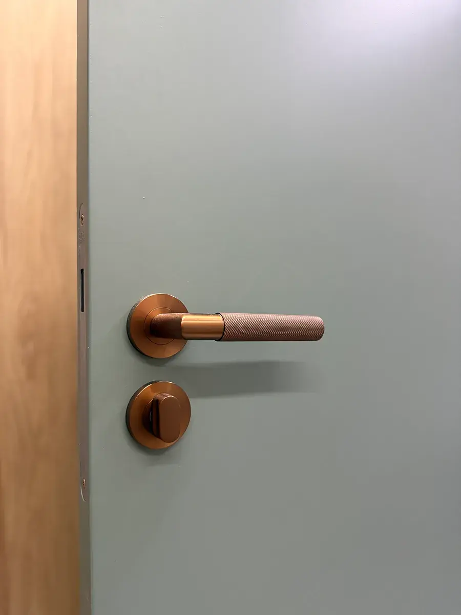 • Interiérové bezfalcové dveře na míru s magnetickou střelkou a designovým kováním.