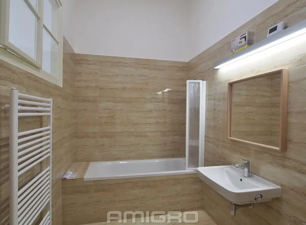 V koupelně je plynový kotel sloužící k ohřevu vody a vytápění bytu.