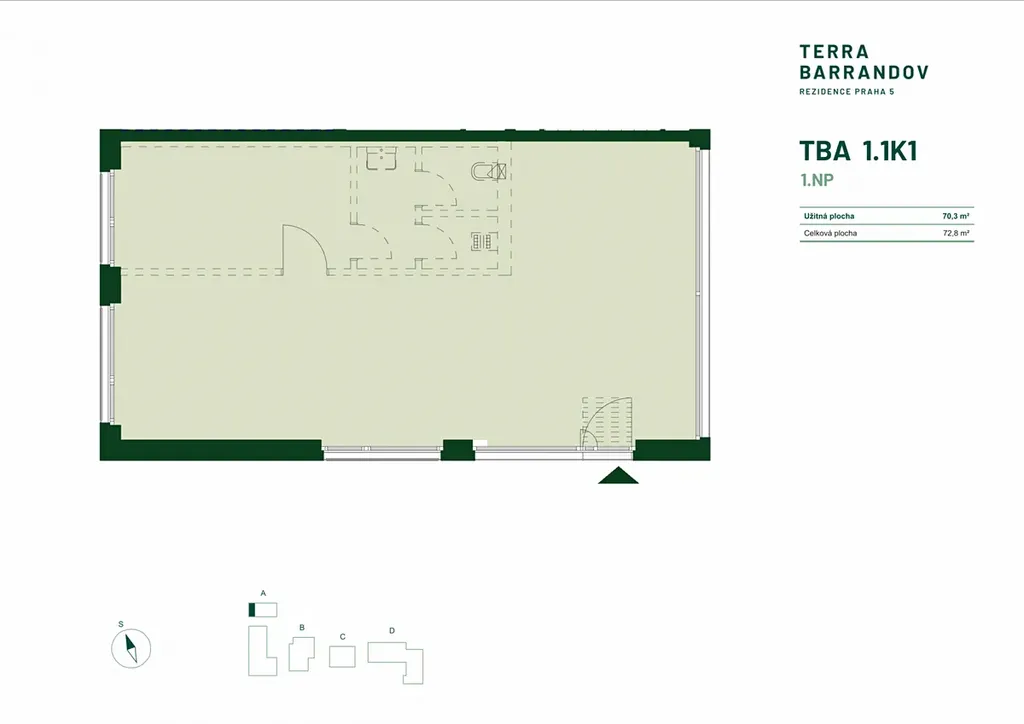 Nabízíme k prodeji atraktivní komerční jednotku o užitné ploše 72,8 m2 v nově vznikajícím rezidenčním projektu Terra Barrandov na Praze 5. Jednotka se nachází v rozvíjející se lokalitě Barrandova s potenciálem stabilní klientely z řad budoucích rezidentů i širokého okolí. Výhodou je umístění na frekventované pěší trase ke tramvajové zastávce.