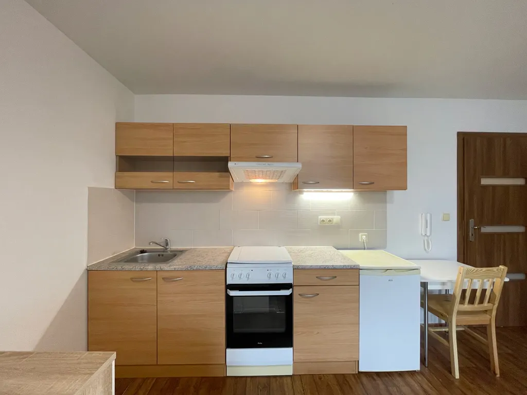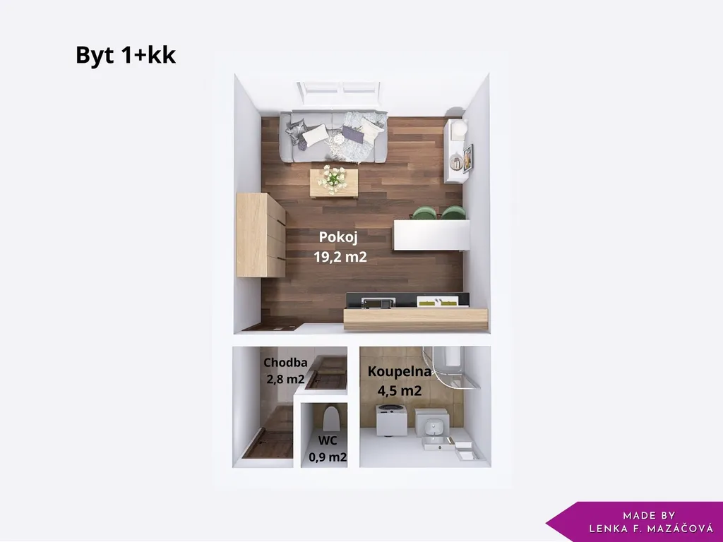 Dispozice bytu je velmi praktická – z chodby s výklenkem vhodným na botník vstoupíte do hlavního obytného prostoru s kuchyňským koutem. Samostatné WC a prostorná koupelna se sprchovým koutem, umyvadlem a místem pro pračku i sušičku poskytují dostatek komfortu.