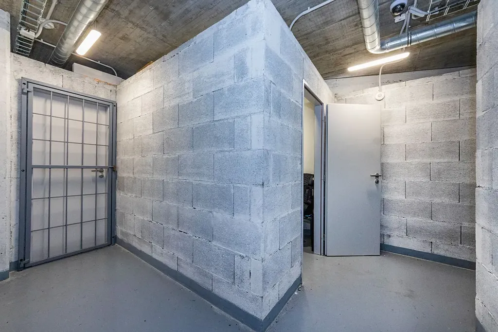 K bytu náleží prostorná sklepní kóje 4 m2 a nadstandardní, rozšířené garážové stání (18 m2, vejde se auto s motorkou) v druhém podzemním podlaží téže budovy.