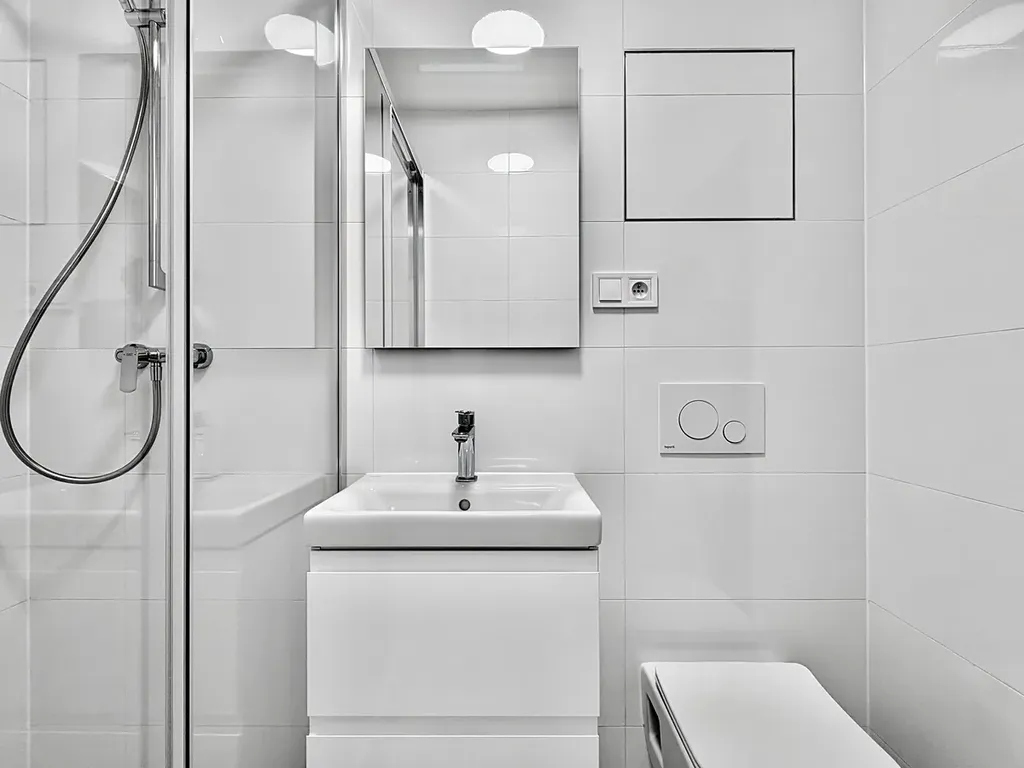 - Moderní koupelna s WC, umyvadlem a sprchou