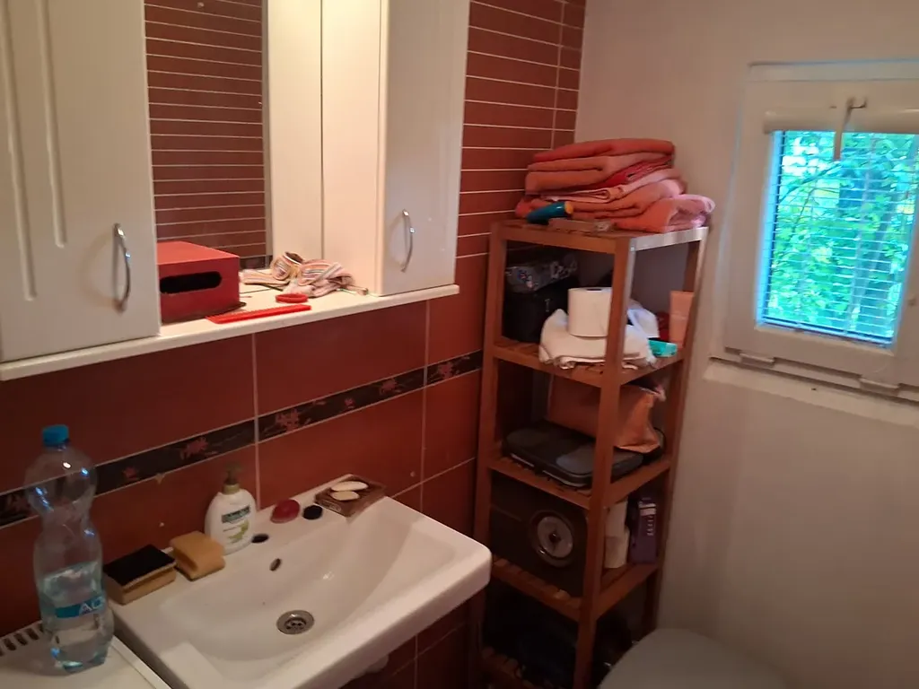 Malá kompletně vybavená kuchyň, obývací pokoj a místnost s umyvadlem a přenosným WC.