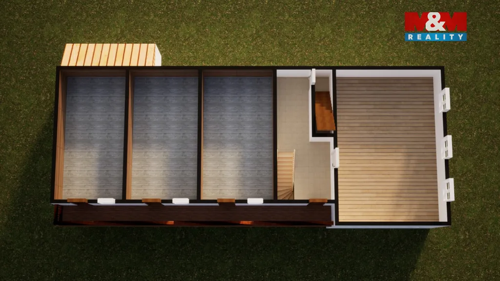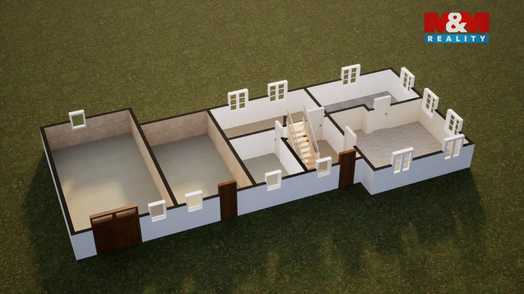 V přízemí najdete hlavní pokoj, vedlejší pokojík, kuchyni a místnost pro koupelnu. První patro vás uvítá velkou místností a přístupem na dřevěnou pavlač, která vede do dalších prostor ideálních pro budování pokojů. Půda a stodola skýtají další potenciál využití.