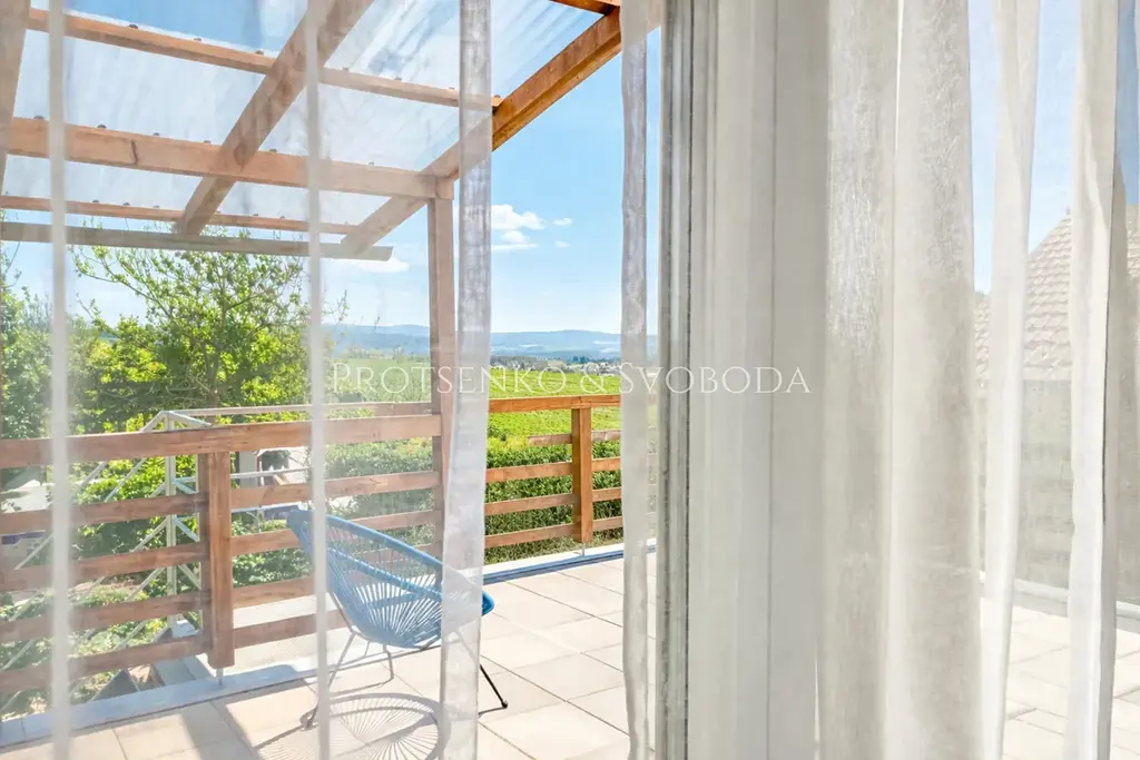 Na tento obytný prostor plynule navazuje velká zastřešená terasa s krásným výhledem směrem k Mohelnici. Právě tady si snadno představíte pomalá rána s kávou, dlouhé letní večery, rodinná setkání i chvíle ticha, kdy kolem vás bude jen zeleň, vzduch a klid. Ze schodů z terasy sestoupíte přímo do zahrady, která je dalším plnohodnotným obytným prostorem tohoto výjimečného domu.