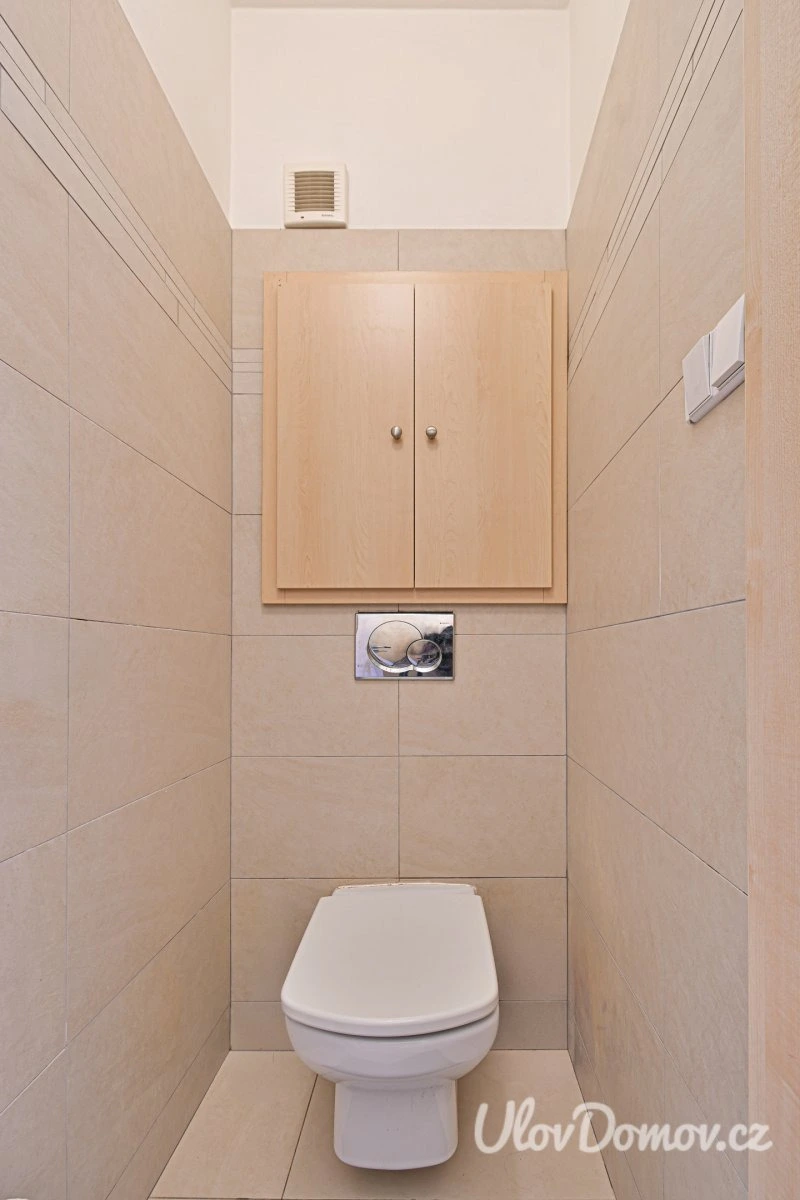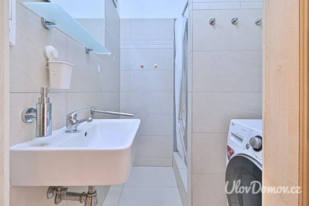 Koupelna je vybavena sprchovým koutem, umyvadlem se zrcadlem a pračkou. Toaleta je oddělená. Velkou výhodou bytu je samostatná šatna, která nabízí dostatek úložného prostoru. K bytu náleží také sklepní kóje.