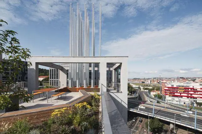 Velkým benefitem je přístup na společnou střešní terasu s krásným panoramatickým výhledem na Prahu.