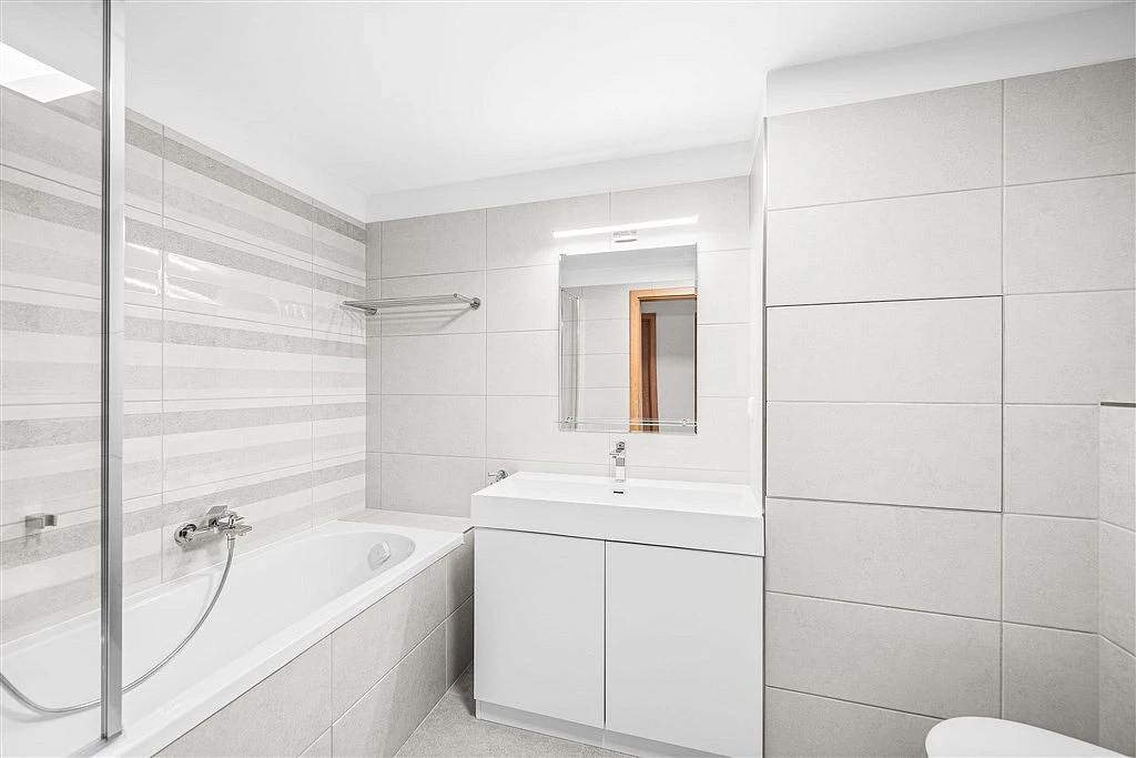 Nemovitost disponuje dvěma koupelnami s toaletou – hlavní koupelna s vanou prošla kompletní a velmi zdařilou rekonstrukcí, druhá koupelna se sprchovým koutem je v původním, udržovaném stavu. V předsíni se nachází prostorné vestavěné skříně, které poskytují dostatek úložného prostoru.
