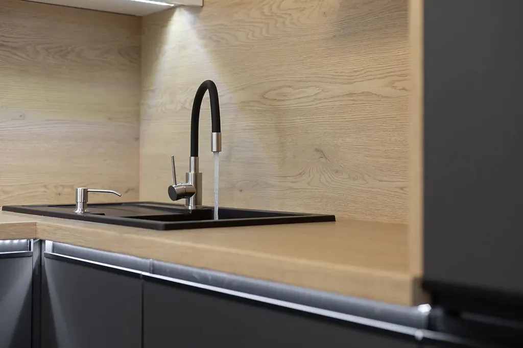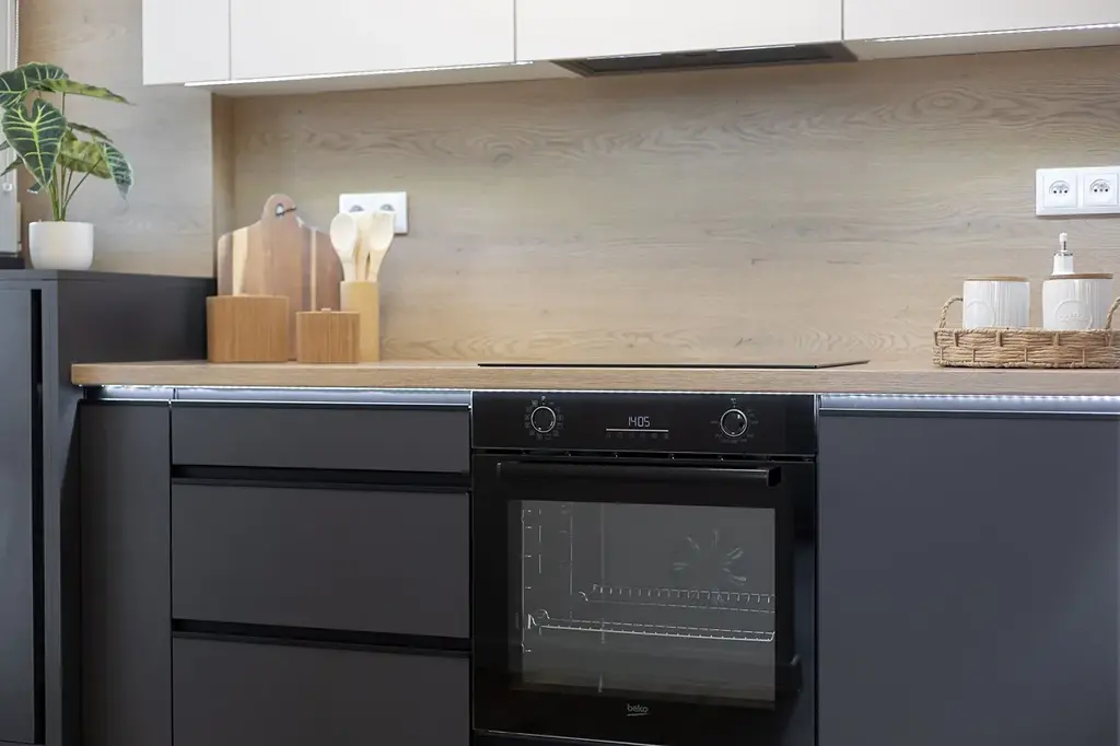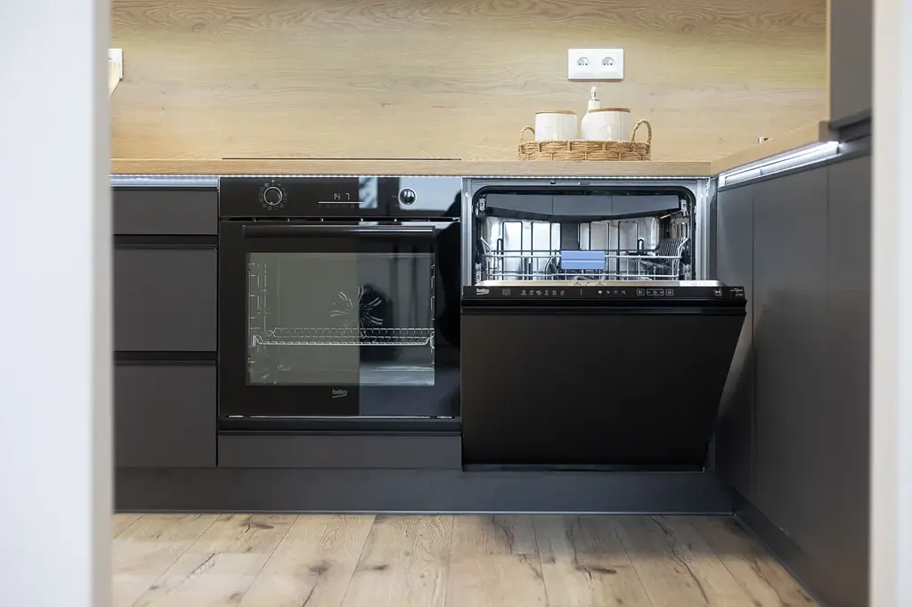 V kuchyni je nová rohová kuchyňská linka na míru v kombinaci antracitu a bílé barvy s vestavěnými spotřebiči lednice s mrazákem, horkovzdušná trouba, indukční varná deska, myčka, digestoř.