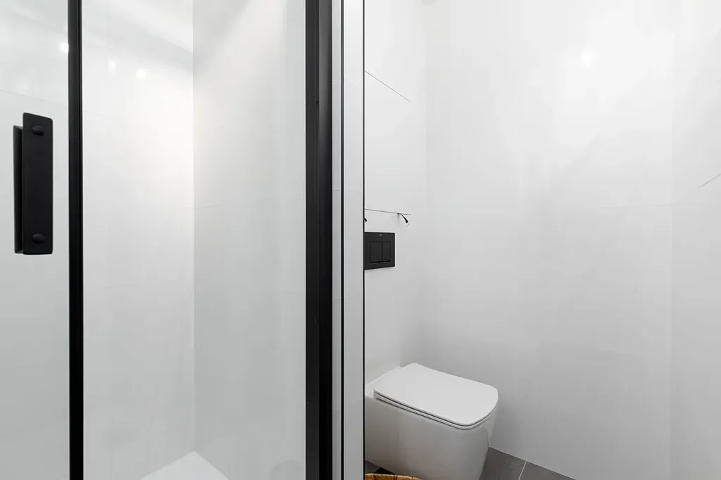 V koupelně jsou obklady a dlažba, které k sobě ladí, nová sanita sprchový kout a závěsná toaleta, která je součástí koupelny.